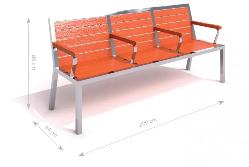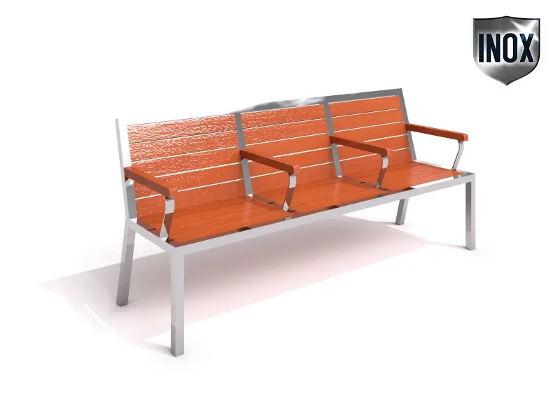 Bänk i rostfritt stål med ryggstöd och fyra armstöd. Sits och ryggstöd i furu, finns i färgerna ek och rosenträ. Sits uppdelad i 3 delar. Bänken behåller det eleganta och enkla utseendet av urbana möbler.