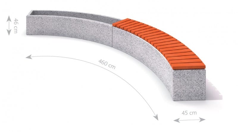 Betongbänken finns i 7 färger utan ryggstöd. Bänk i form av båge. Sitsen är gjord av trä. Bänken är ett bra val för bekväma och snygga urbana möbler i bl.a parker. Konstruktionen av denna bänk gör intrycket av lätta och estetiska möbler, bäst för stadsrum.