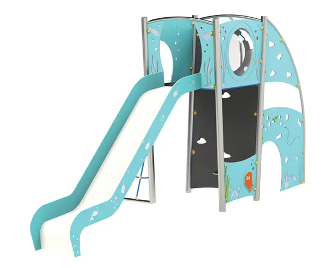 Vores tårn, der hjælper med at kravle og klatre i flere udgaver, med en form, der imiterer bobler, med sine små, fremspringende mønstre, udvikler også finmotoriske bevægelser, da kun dygtige hænder kan trække fisken på panelet. Produktet inkluderer en rustfri stålrutsjebane og et klatrenet med stålindlæg, der også udvikler en balancesans, så produktet anbefales til større børn.