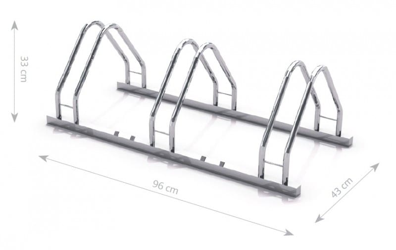 Cykelställ i stål för 3 cyklar. 3 omvända L-formade fästen för hjul sammankopplade med bottenstålprofil.