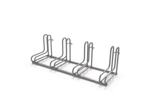 Cykelställ i stål för 4 cyklar. 4 L-formade fästen för hjul sammankopplade med bottenstålprofil.