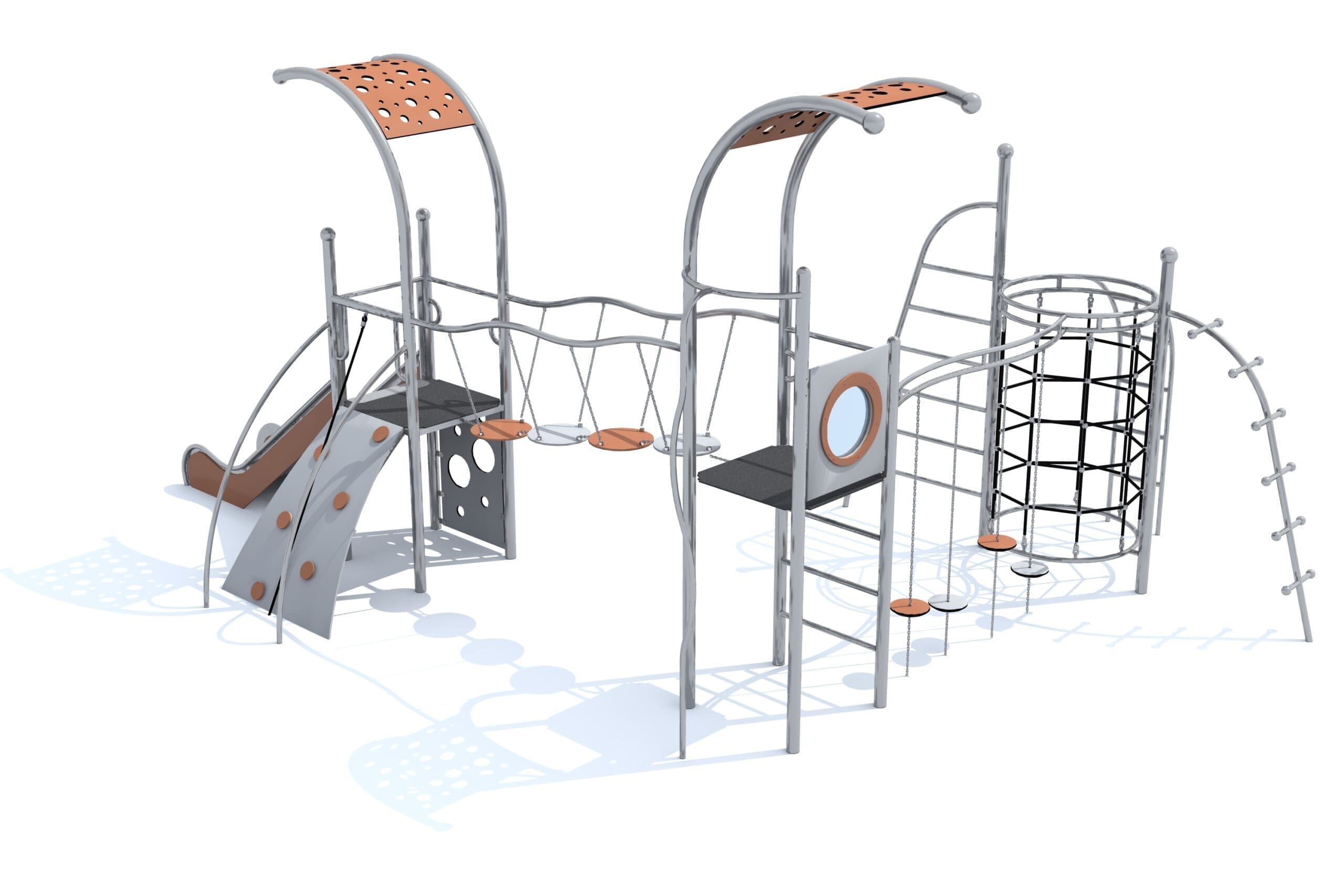 Klätterställning med inspiration av snigelns former och levande färger. Konstruktion och rutsch av rostfritt stål som är resistent mot väderförhållanden och intensiv användning.