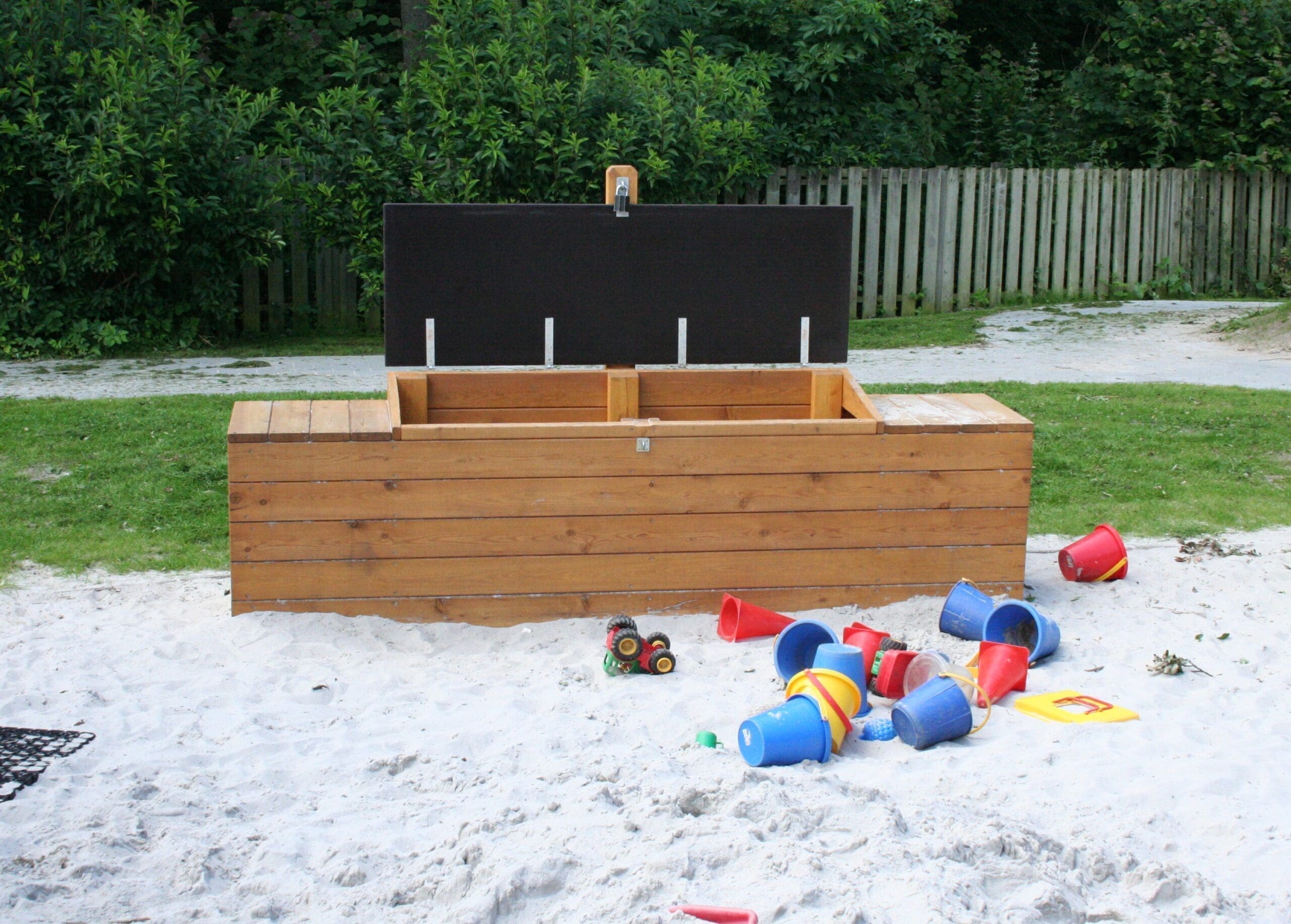 Praktisk förvaringslåda, för olika lekredskap. Lådan kan även fungera som ett litet lekbord i sandlådan.