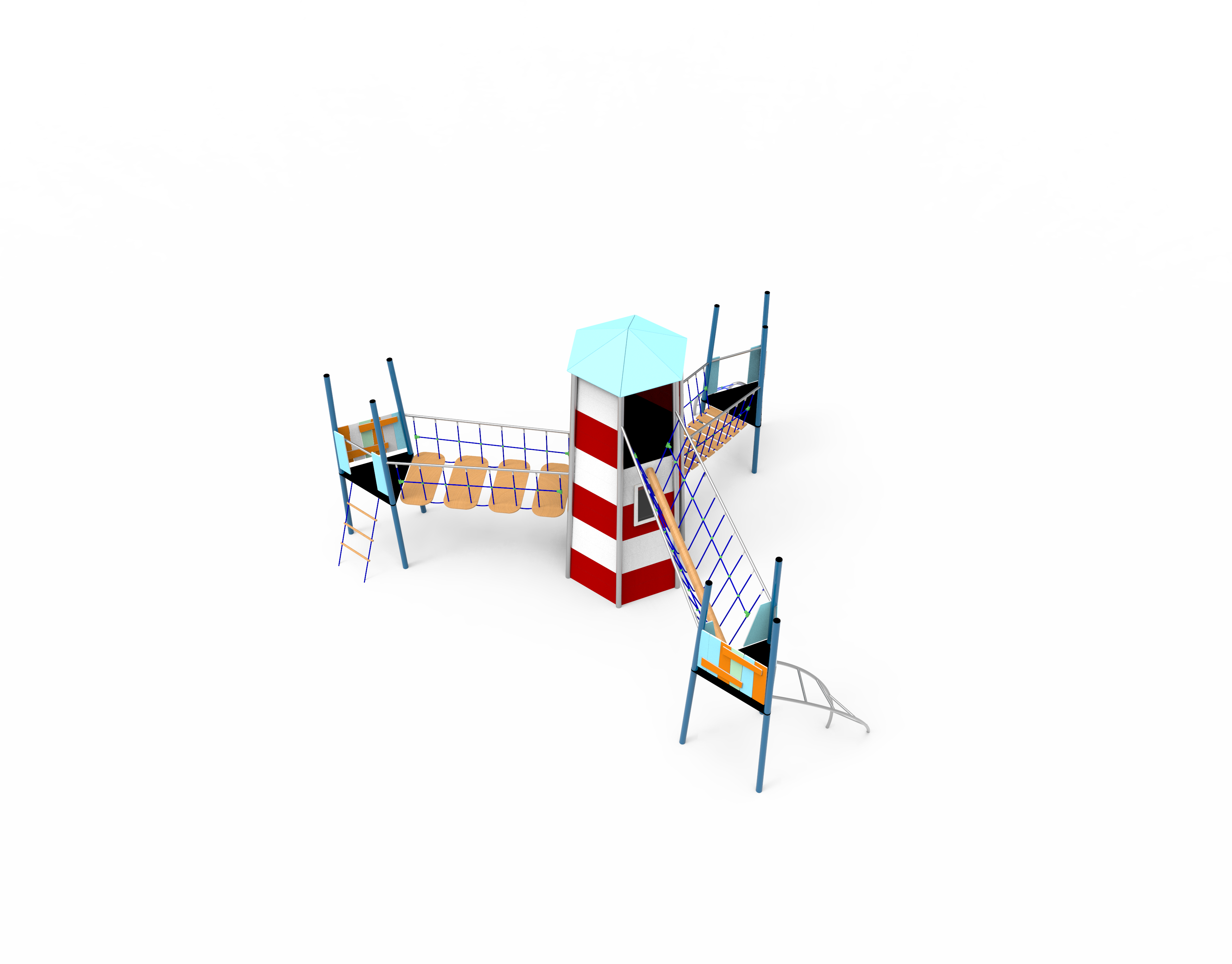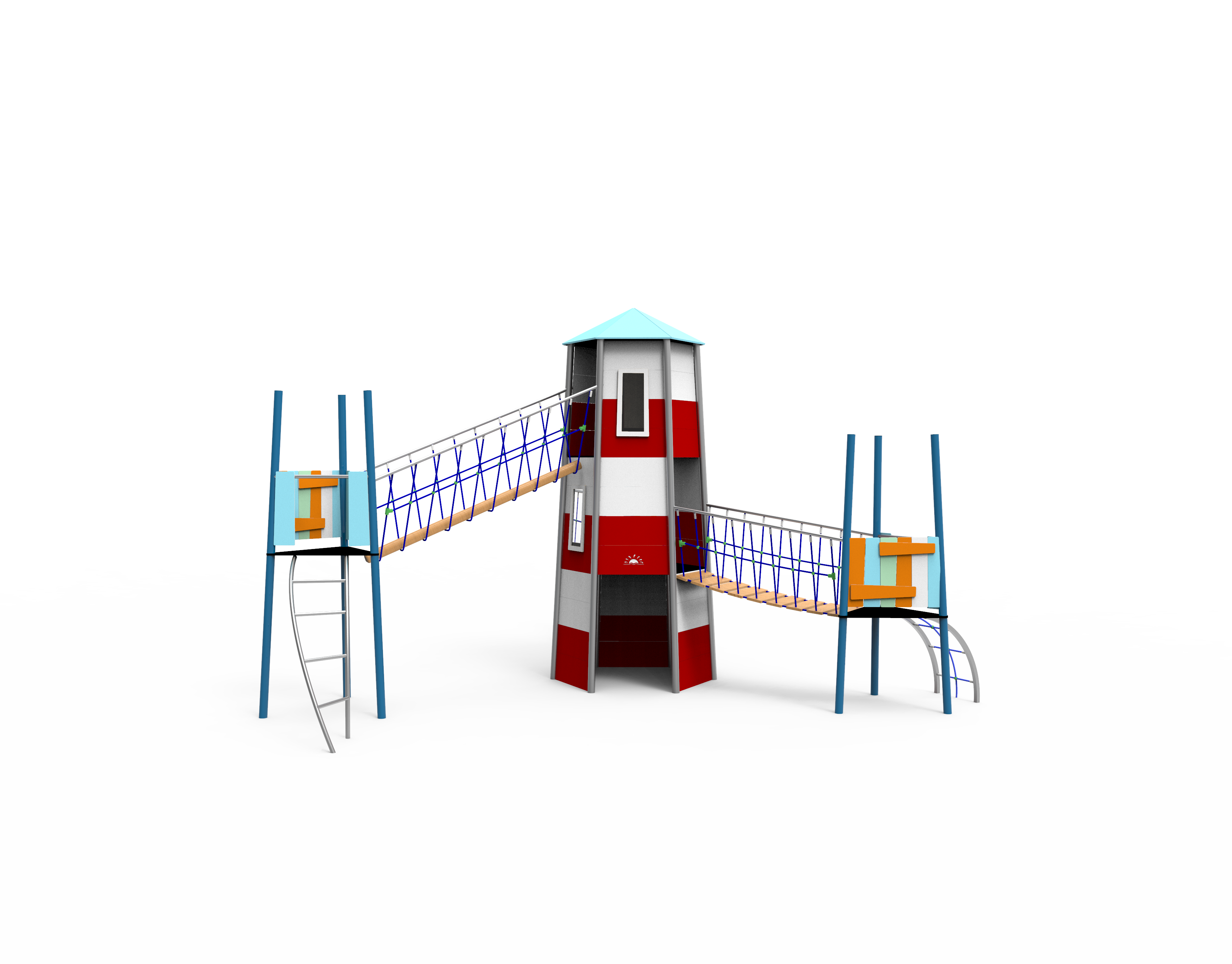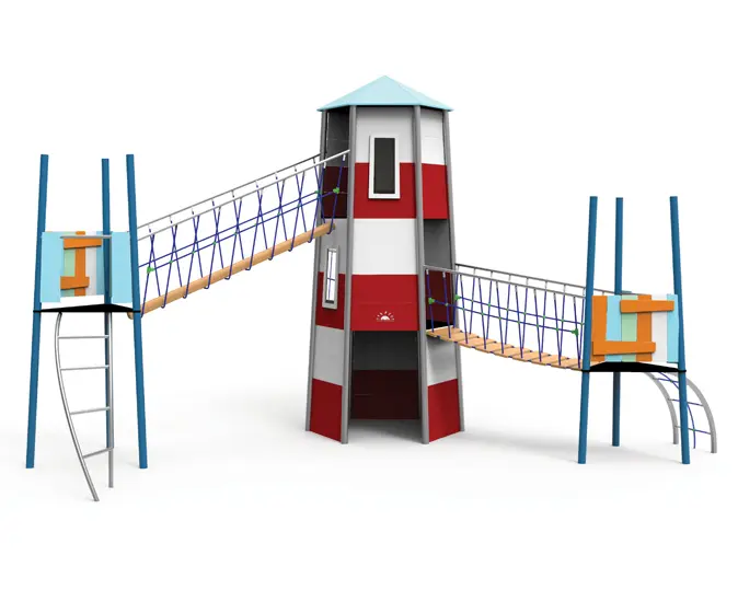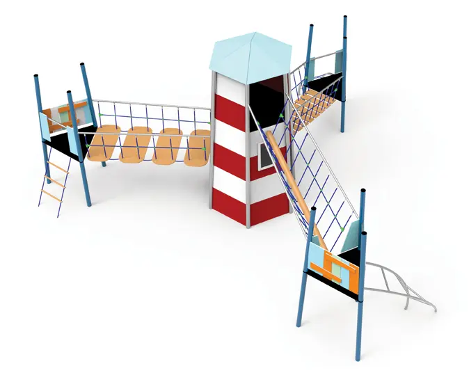 Spillets design: det centrale sekskantede tårn, der er åbent på den ene side, er forbundet af tre klatrende sidetårne, der giver en anderledes spiloplevelse. Du kan komme til niveauerne i det centrale tårn på metalstiger med snoet ramme, rebstiger og rebbroer og tunneller. Broerne og tunnellernes gangflade er en bjælke og trinplatforme af forskellig bredde.