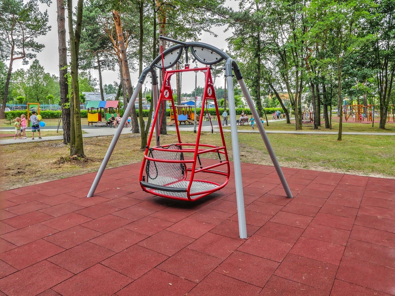 Gondolgunga för 1 rullstolsburen person. Användaren kan själv sätta gungan i rörelse eller stoppa den med hjälp av rep.