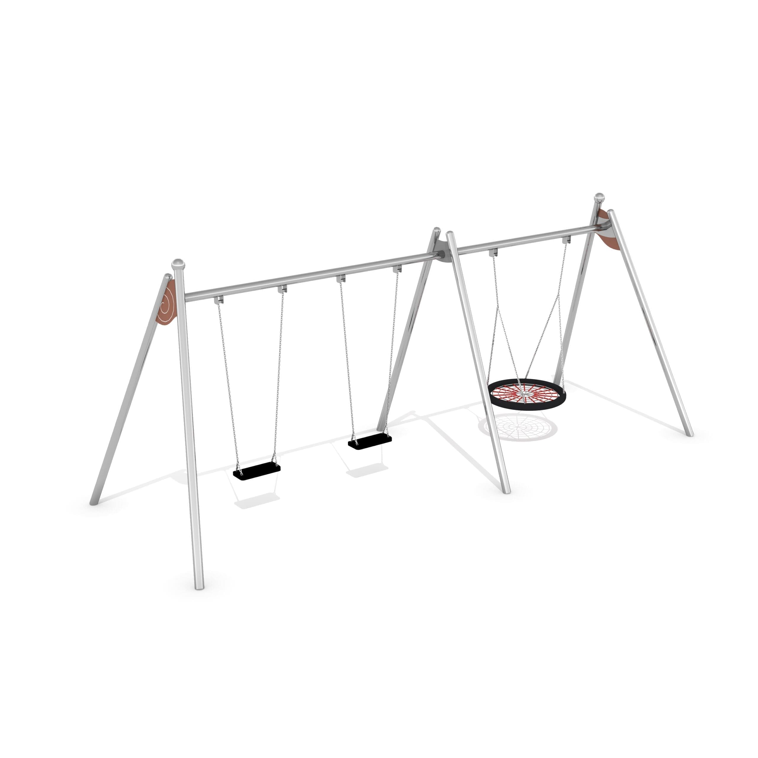 Trippelgunga som består av dubbla säkerhetssitsar och en fågelbogunga. Konstruktion gjord av rostfritt stål som är resistent mot väderförhållanden och intensiv användning.