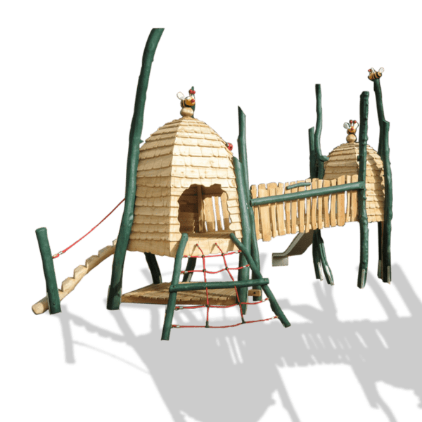 En unikt utformad klätterställning inspirerad från bikupan. Utrustad med klätterramp, trappsteg, bro, klätternät och tre olika plattformar.