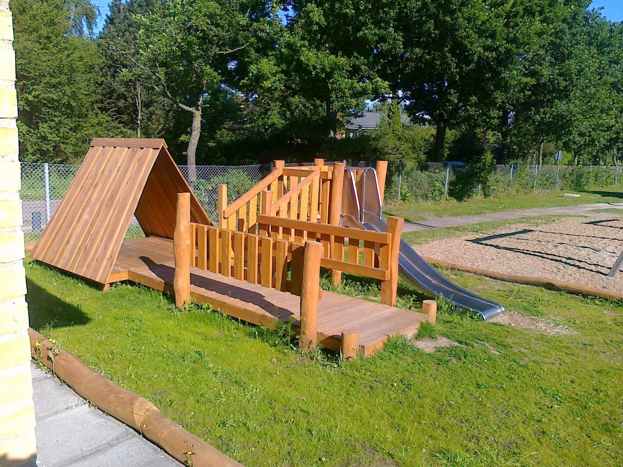 Lekstugan har en gångbro över till tornet med rutschkana.