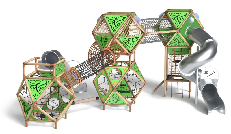 SFERO FOREST 4-1 är ett heltäckande leksystem med fyra bollar och två rutschkanor i naturtema. Den komplexa designen uppmuntrar till kurragömma och social interaktion. Strukturen är mycket stabil tack vare den arkimediska designen på varje boll. Utrustad med en blandning av stängda och öppna paneler, nät och tunnlar som skapar en labyrintisk känsla. Färgtema: Beige/Brun/Grön (Forest).