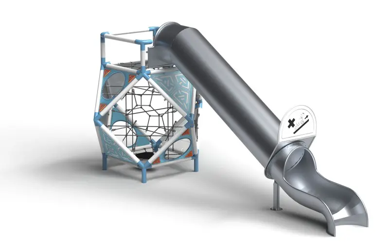 SFERO SPACE 1-2 kombinerar modern teknik med en distinkt design. Setet består av en sfärisk modul som är ansluten till en rak rörrutschbana. Sfären är konstruerad som en arkimedisk kropp med 24 stålrörskanter, vilket ger den en mycket robust form. Utrustningen består av triangulära frästa paneler, invändiga ramper, klätternät och en rutschkana i rostfritt stål eller plast (beroende på val). Utvecklar koordination och rumsuppfattning. Färgtema: Grå/Blå (rymd).