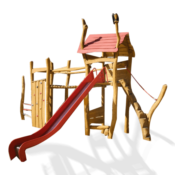 Klättersystem med 2 plattformar, stolpe med trappsteg, hängbro, brandmansstång, klättervägg, 2 balansbommar, rutschkana och balansrep