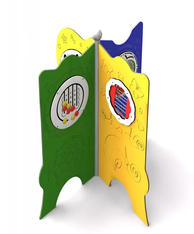 Et firedobbelt sansebræt til kreativ leg med en lyd, der forstærker kreativiteten og sanseoplevelsen hos børn, også dem i kørestol. Udstyret har fire paneler: et med runde elementer, der kan bevæges langs de udpegede spor i forskellige retninger, et med et drejende hjul, der laver lyden af regn, når det drejes, et med tre let-at-rotere bevægelige gear, og et med farverige roterende tromler producerer en dejlig maraca-lignende lyd. Pladens struktur er pulverlakeret sort stål, vejrbestandig og klar til intensiv brug. Tavlen er lavet af HDPE plast. Stængerne er afsluttet med sfæriske dekorative elementer.