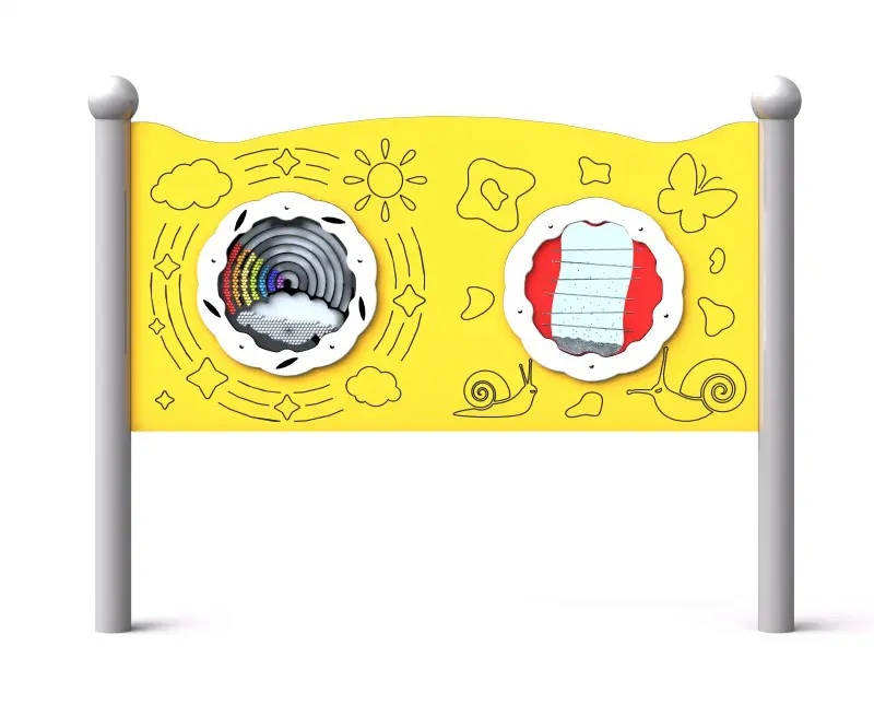 Et dobbelt sansebræt til kreativ leg med en lyd, der forstærker kreativiteten og sanseoplevelsen hos børn, også dem i kørestol. Udstyret har to paneler: det ene med et hurtigt roterende hjul med 100-tals regnbue og skyfarvede UV-stabile plastikbolde og det andet med et snurrende hjul, der laver lyden af regn, når det drejes. Pladens struktur er pulverlakeret sort stål, vejrbestandig og klar til intensiv brug. Tavlen er lavet af HDPE plast. Stængerne er afsluttet med sfæriske dekorative elementer.