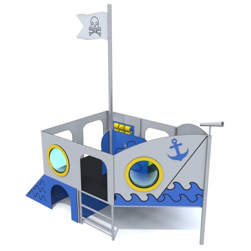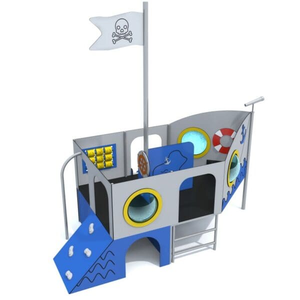 Lekredskap föreställande ett skepp. Modellen är gjord av galvaniserat, pulverlackerat stål, resistent mot väderförhållanden och intensiv användning. Väggarna är gjorda av HPL-skiva, och ytterligare dekorativa element är gjorda av HDPE. Plattformen är gjord av HPL-skiva med en halkfri yta, vilket garanterar säker användning.