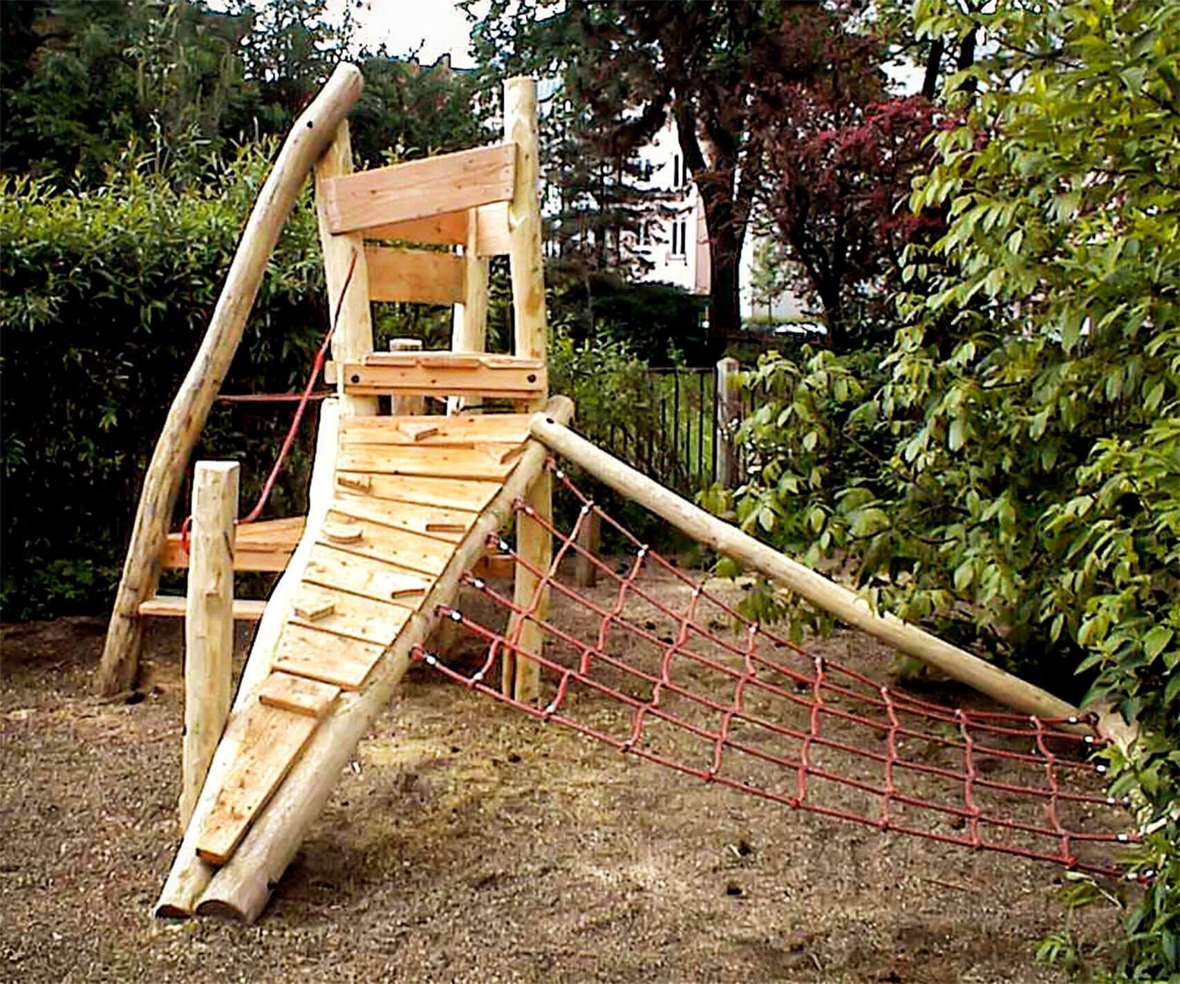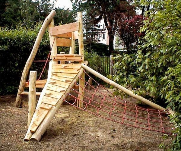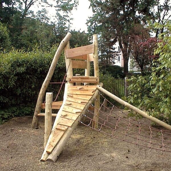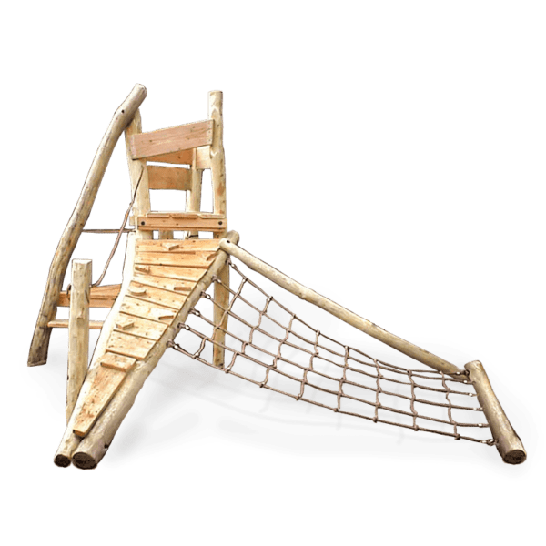 Klättersystem med plattform, klätternät, klätterramp med steg och rep