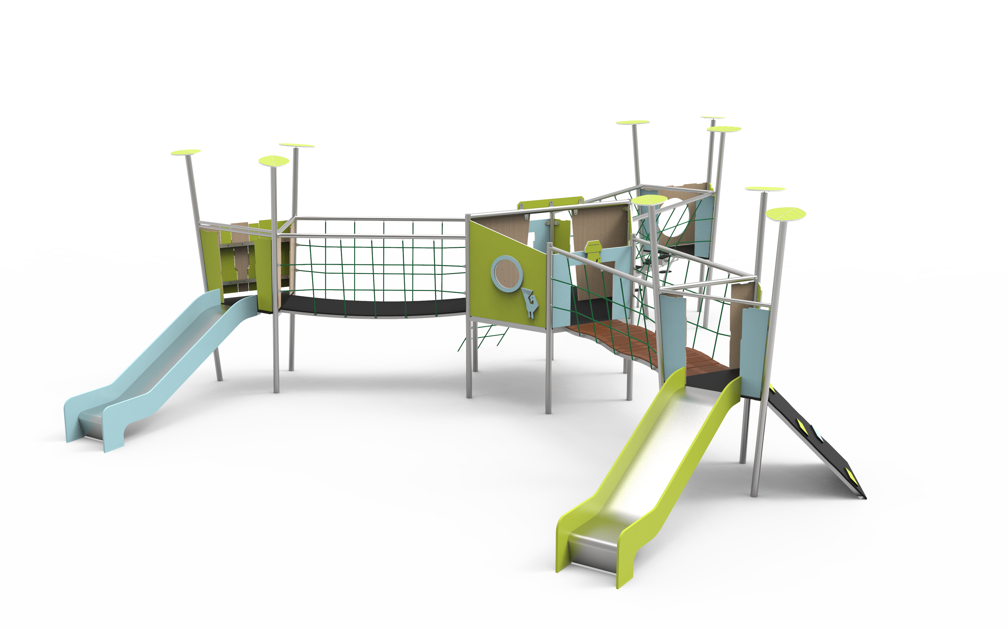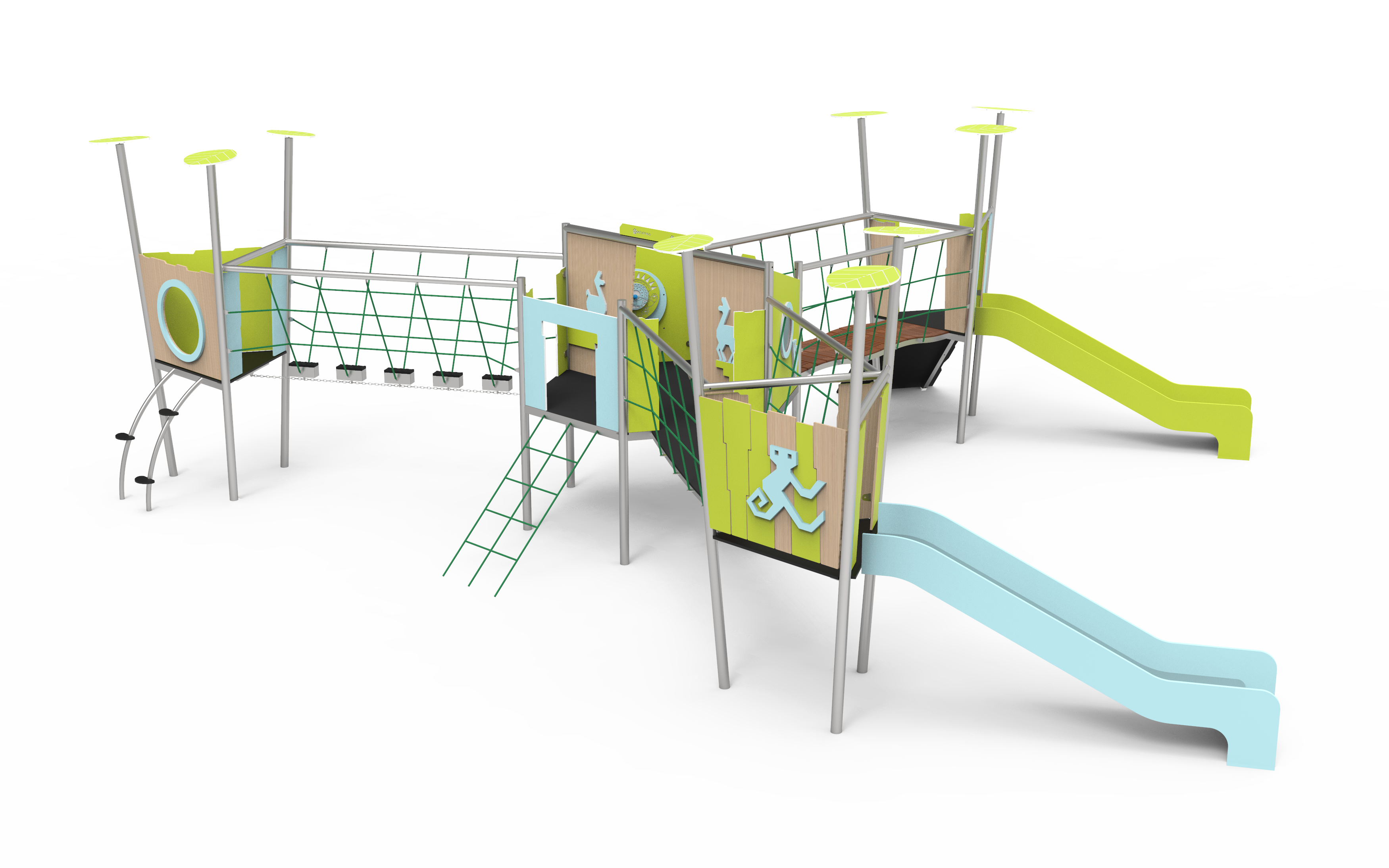 Mønstrene, der er synlige på pladerne og sidepanelerne, er dannet af en CNC-fræser med høj præcision, så udvalget af forskellige formvariationer er uendeligt; skov dyr og plantemønstre optræder her. Tårnene er forbundet med broer af forskellig sværhedsgrad: gummieret HDPE-bro, HDPE-pæle lagt i en bølget linje og dragere forbundet og ophængt med kæder. Disse broer tester dine muskler, koncentration og balancesans.