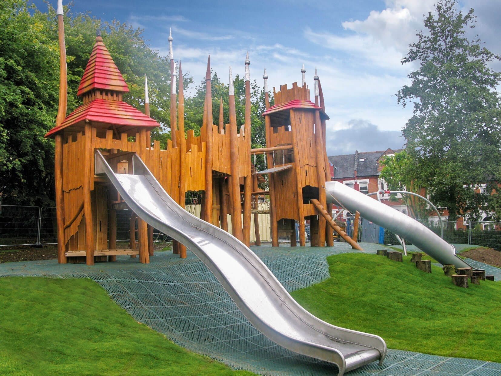 Lekslott med lång rutschkana, rutschrör och brandmansstång