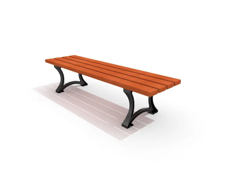 Støbejernsbænk uden ryglæn og armlæn. Sæde lavet af træ. Bænken bevarer det elegante og æstetiske udseende af urbane møbler med buede stålformer i hånden med træ.
