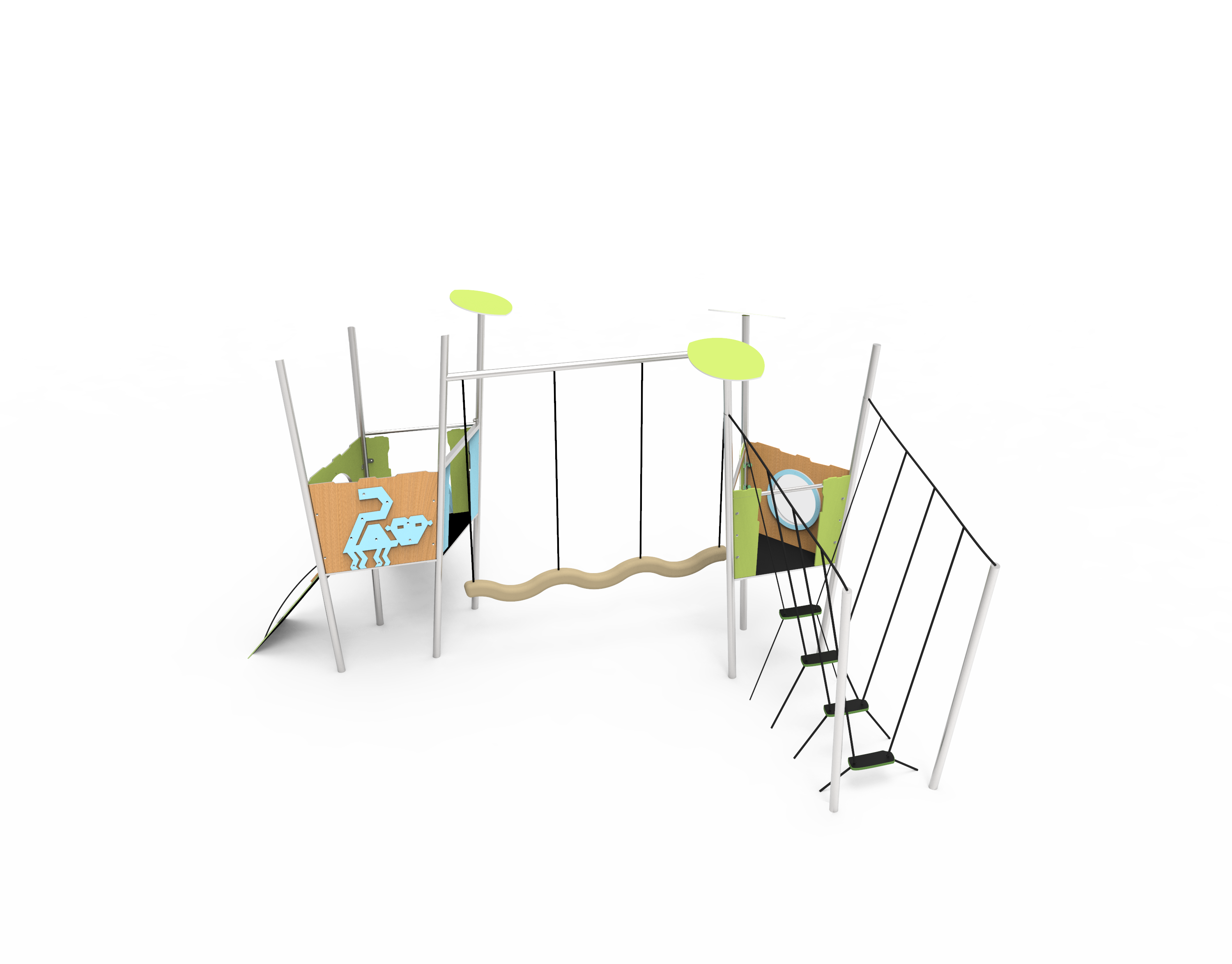 Rebelementer 16 mm tyk vandalsikker, snoet stålindsats, polyethylenbelagt, UV-bestandigt reb, plastik ved samlingspunkterne, fastgjort med skruer, fastgjort med revnede noder, fastgjort til legetøjets ramme med pressede aluminiumsærmer. Det ophængte bølgede tykke rebelement er et flettet Fennex polyesterreb fastgjort i bunden og toppen.