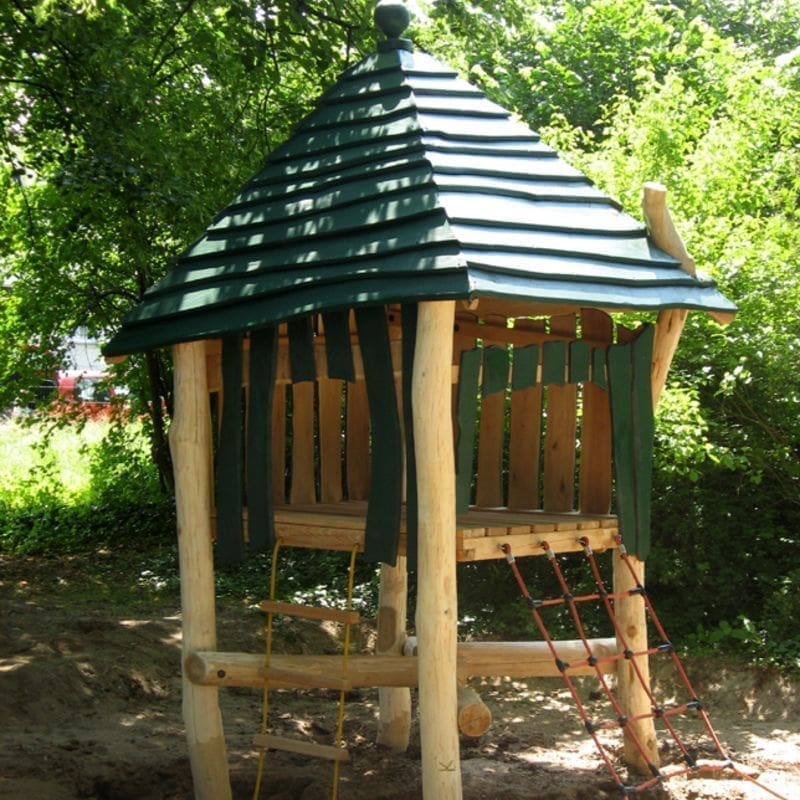 Lekhus på stolpar med klätternät och repstege