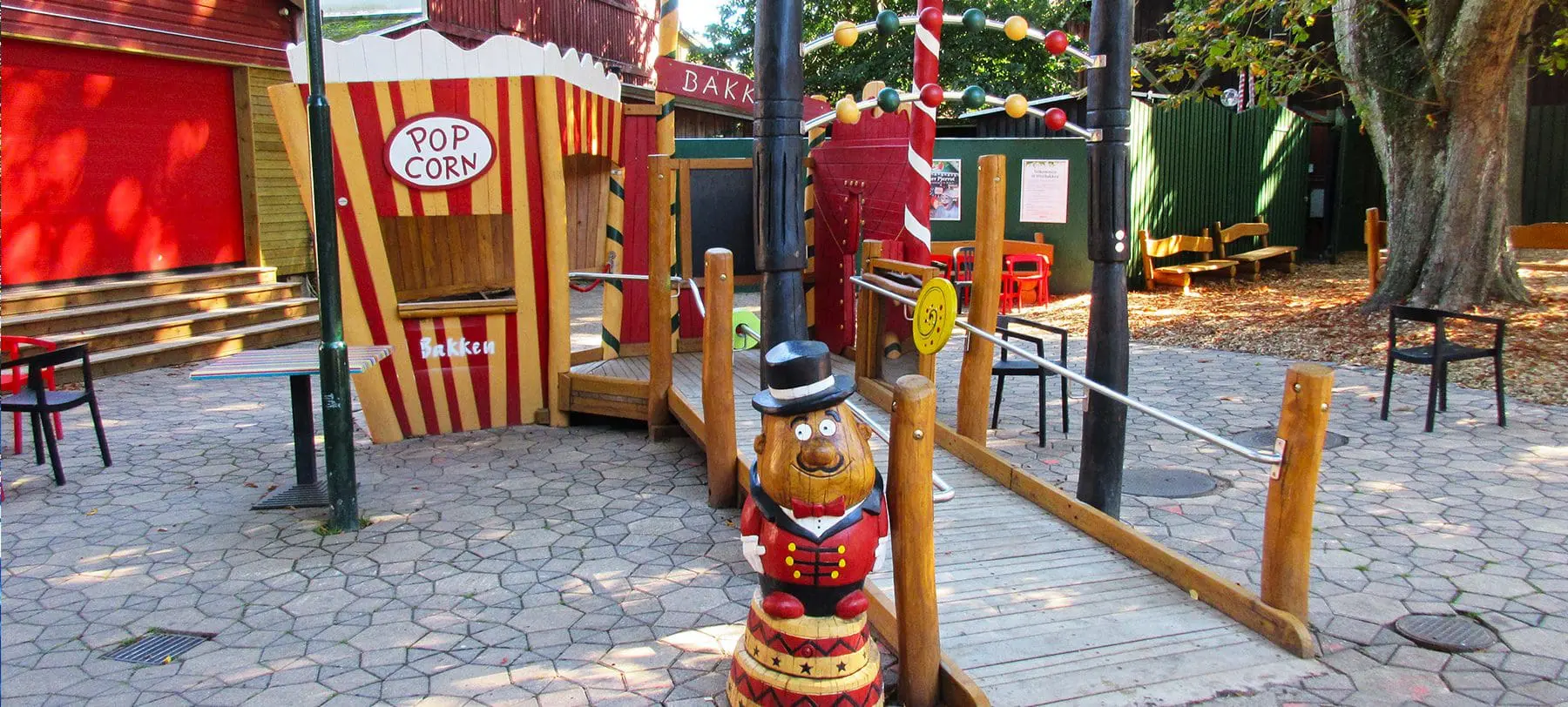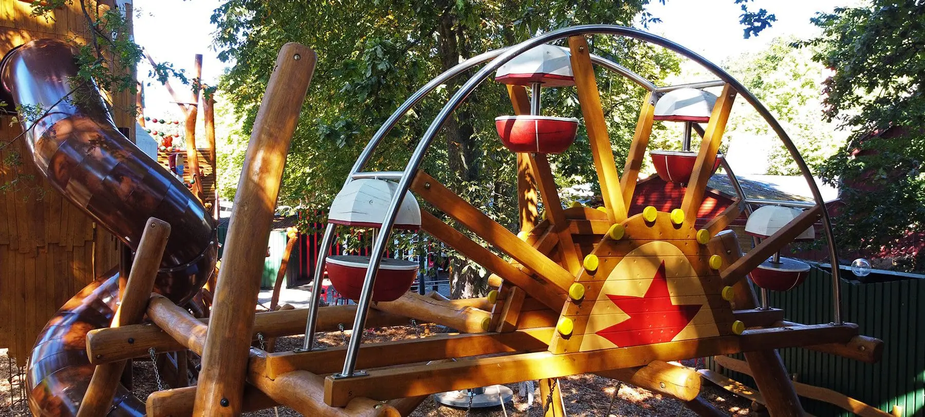 Legepladsen er for alvor skræddersyet til Bakken og lokationen inde i en lomme bag den ikoniske gamle trærutschebane, Spøgelsestoget og Tårngyset.