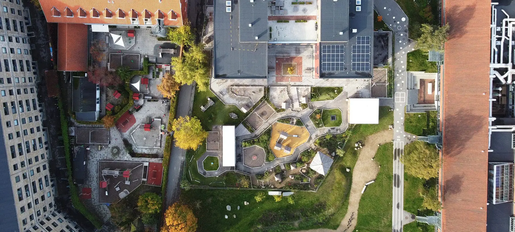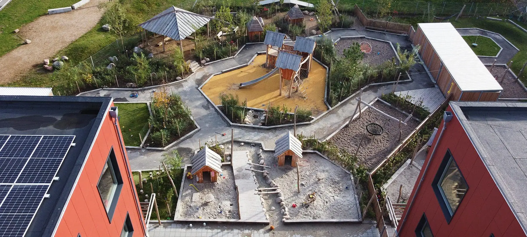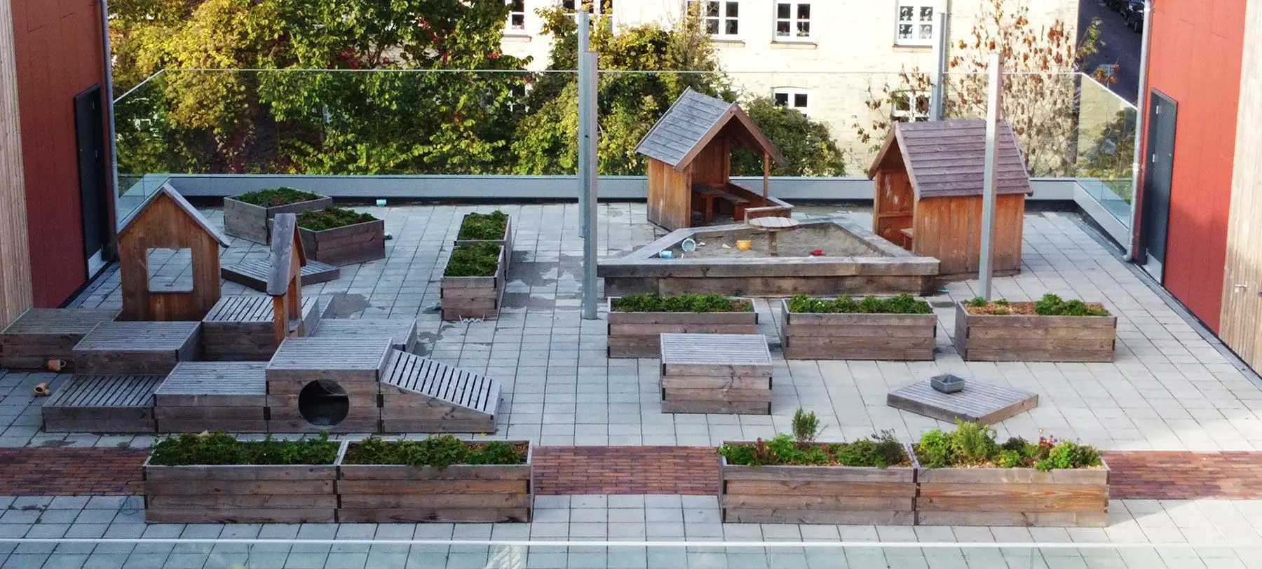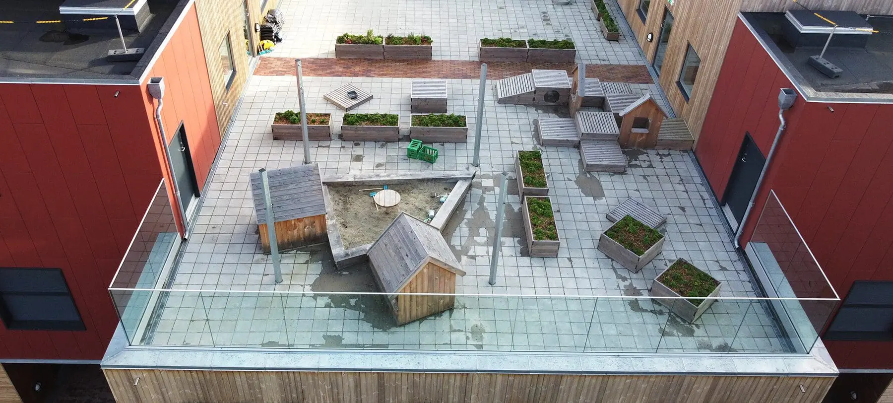 Projektet er udført i både gadeplan og på tagdæk, som tilsammen skaber en komplet daginstitution hvor alle mulige m2 er udnyttet til leg og udendørsaktivitet.