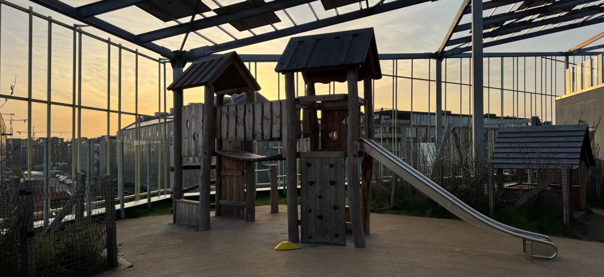 Flere og flere steder skabes anlæg og områder udenfor på tagflader – både på skoler, børneinstutioner og plejehjem. Det giver udfordringer med fastgørelse af de mange elementer, men det kan altså løses. Særligt her i “Børnehuset i Sydhavnen” er resultatet blevet en stor succes – både børn, forældre og pædagoger elsker de mange muligheder og nem adgang direkte inde fra stuerne.