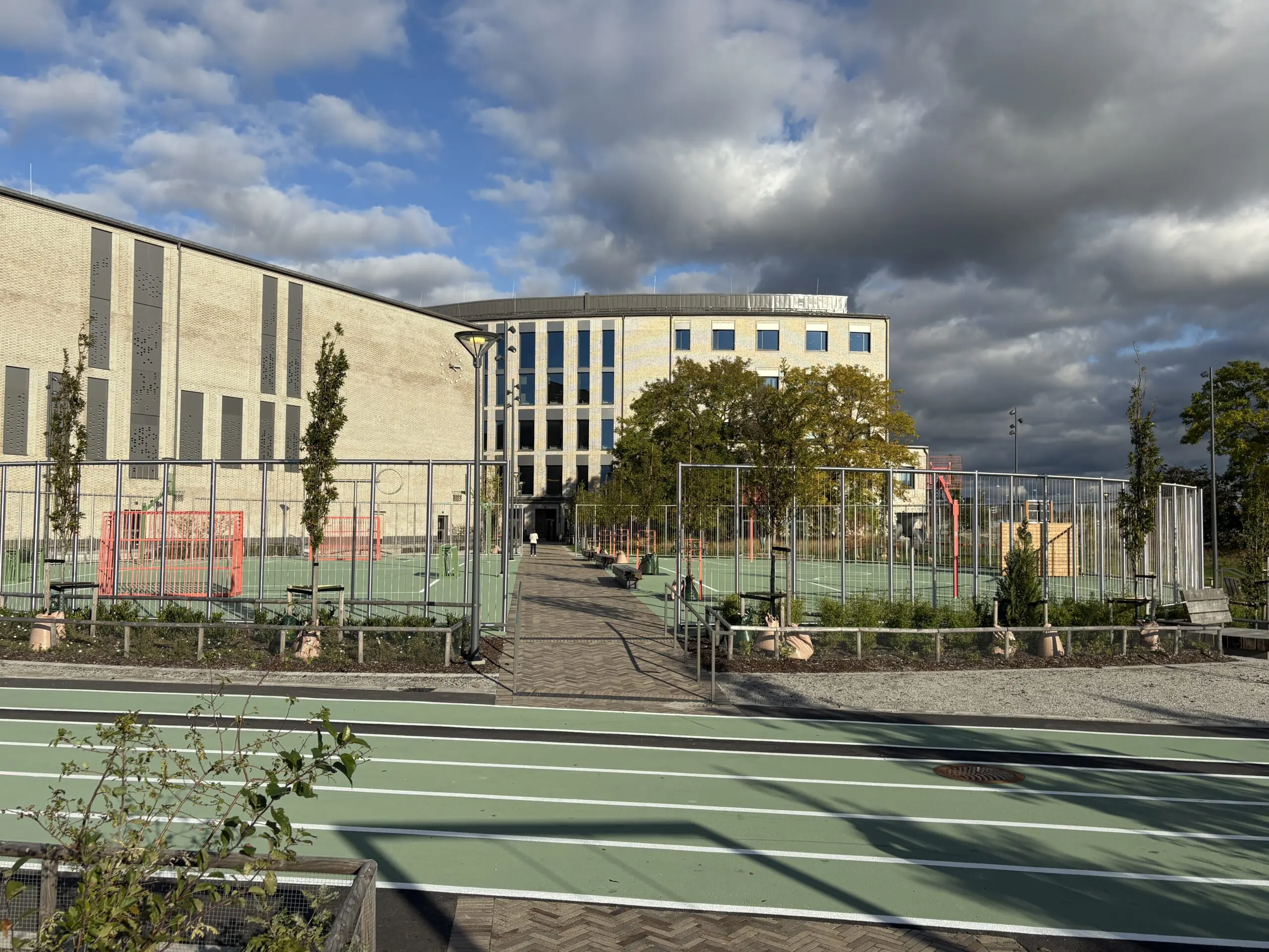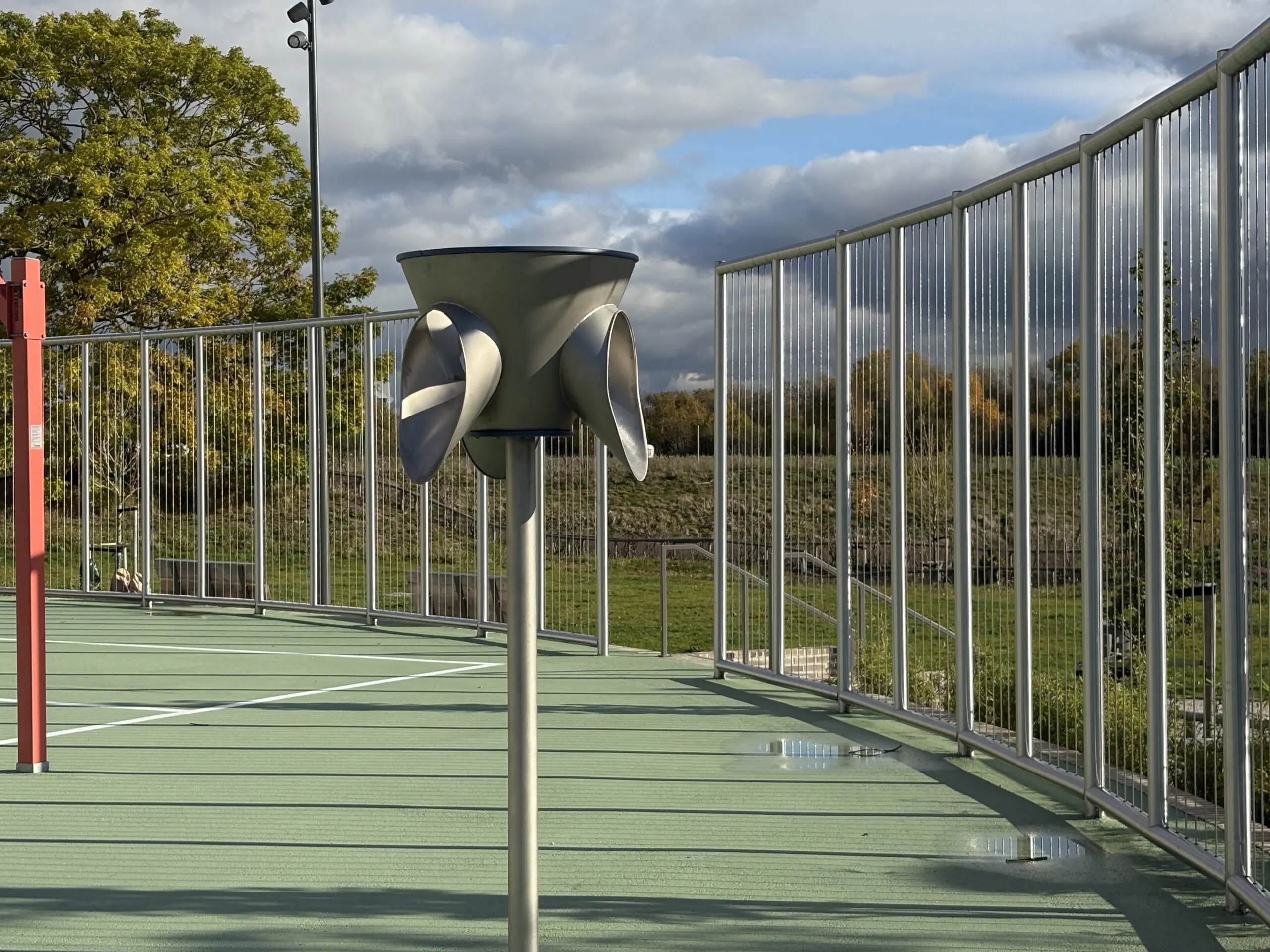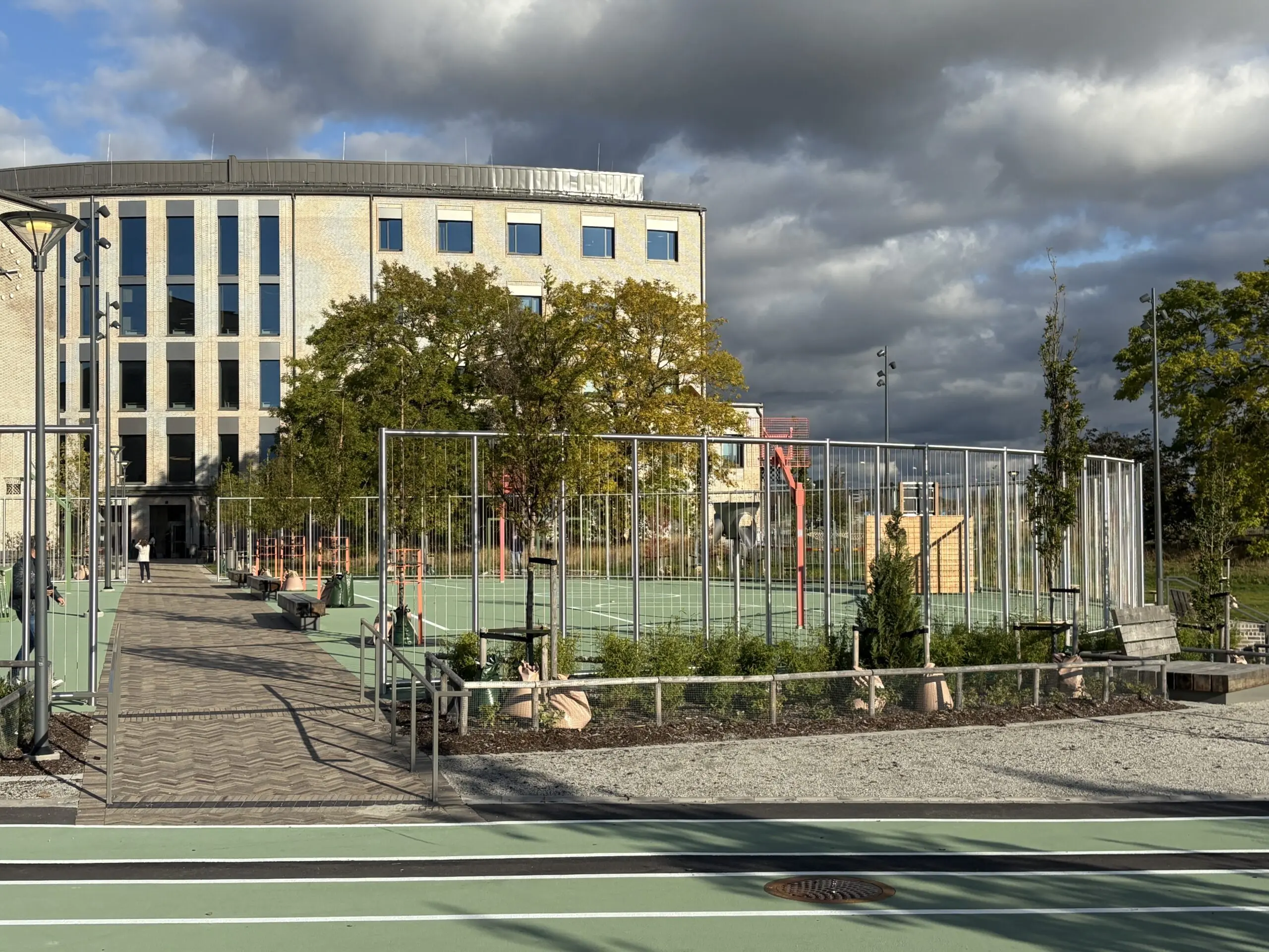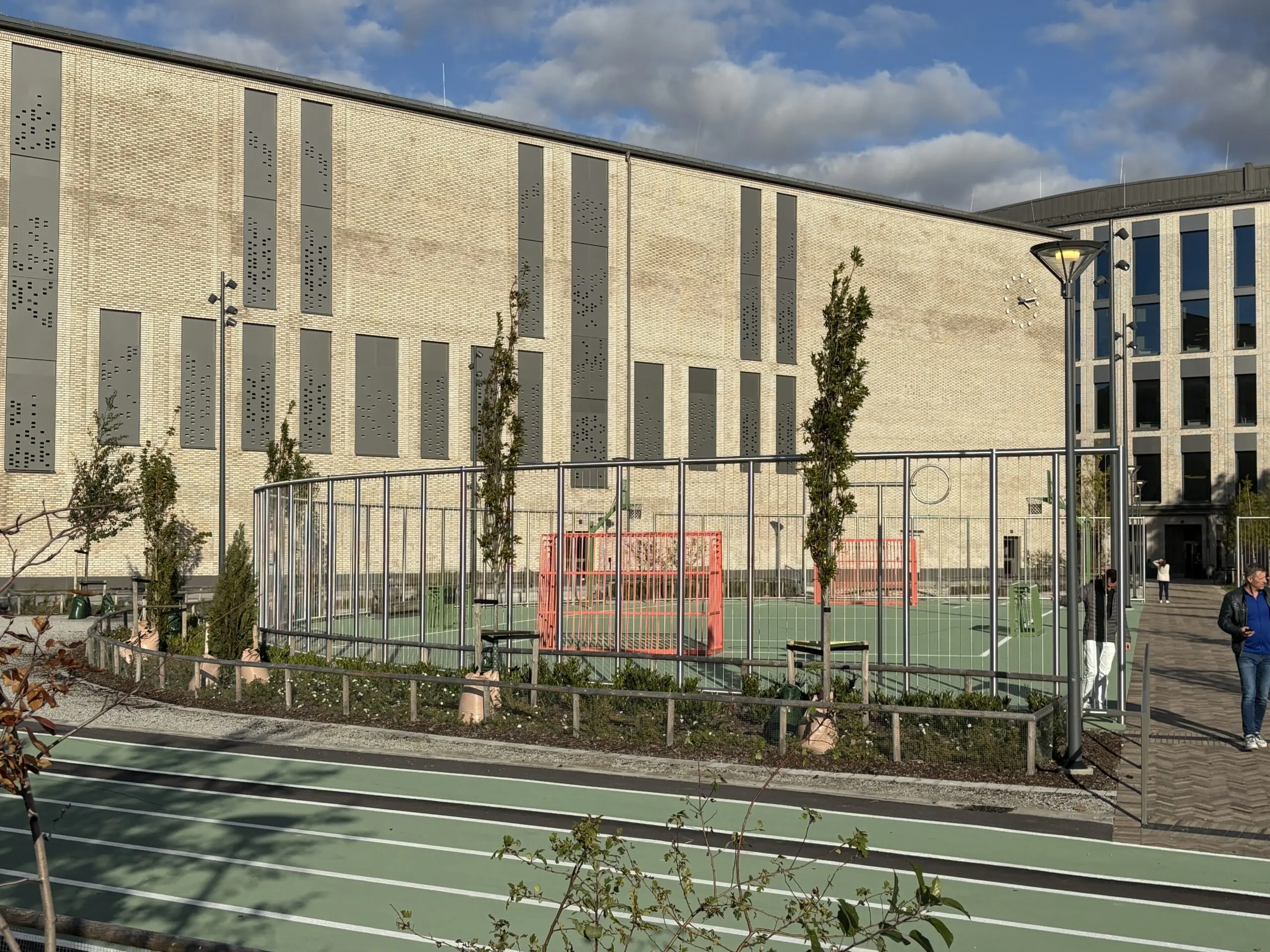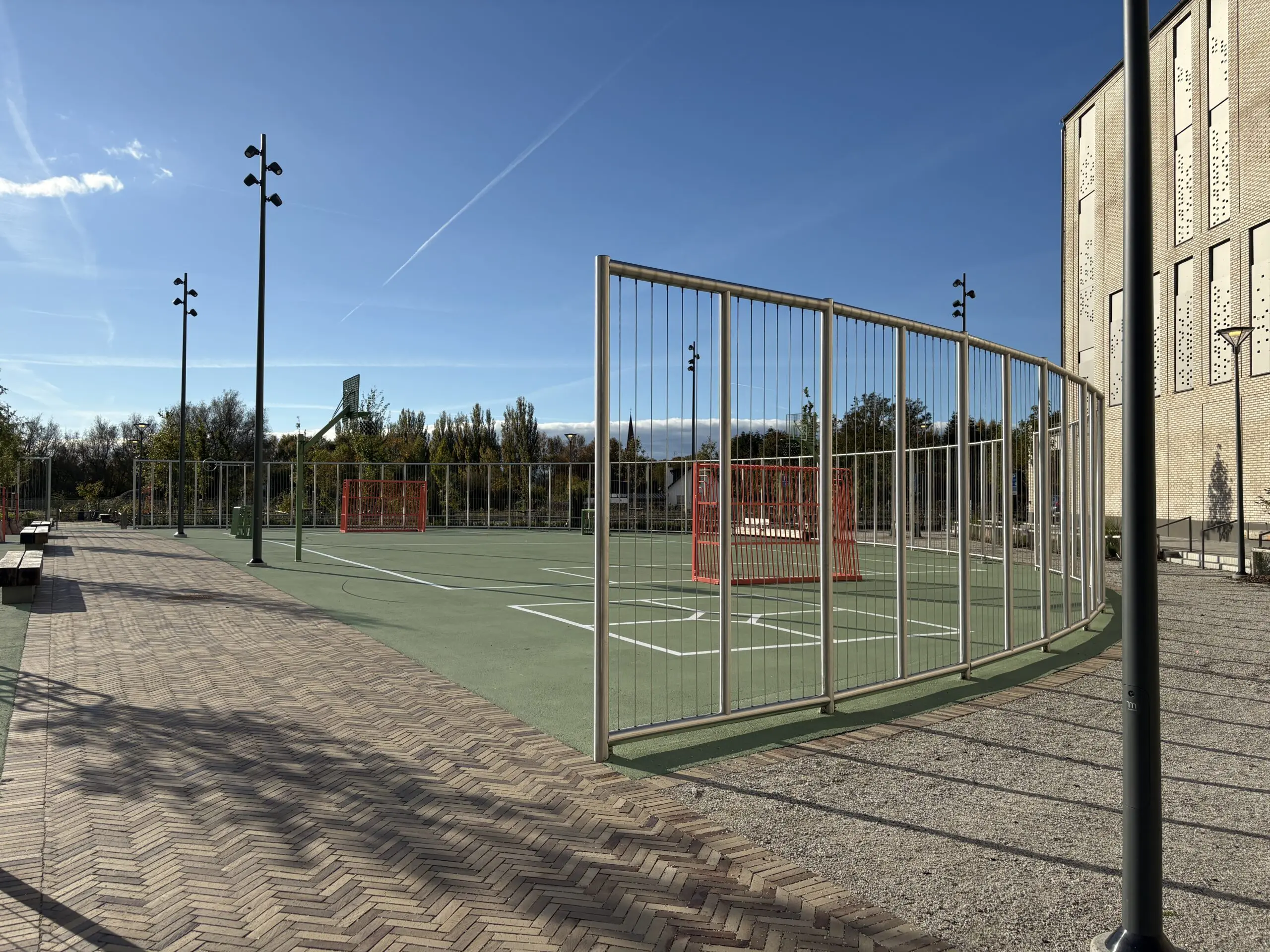 Cable Box vid Alléskolan i Malmö är en robust och funktionell konstruktion i rostfritt stål, utvecklad för lång livslängd och minimal underhållsinsats. Arenan är utrustad med fjäderupphängda vajrar som effektivt dämpar ljud vid bollträffar och skapar en lugnare utemiljö. Designen är framtagen av Arkitektbyrån Edge i Malmö och förenar teknisk precision med modern estetik. Cable Box erbjuder en hållbar och ljuddämpande lösning för skolor och offentliga miljöer. Projektet färdigställs och invigs sommaren 2025.