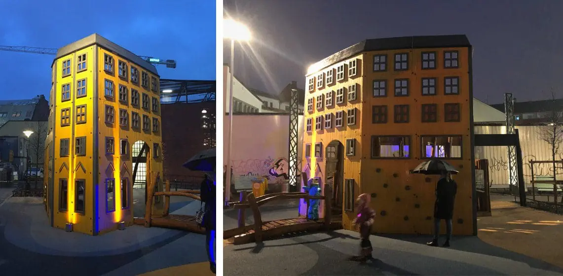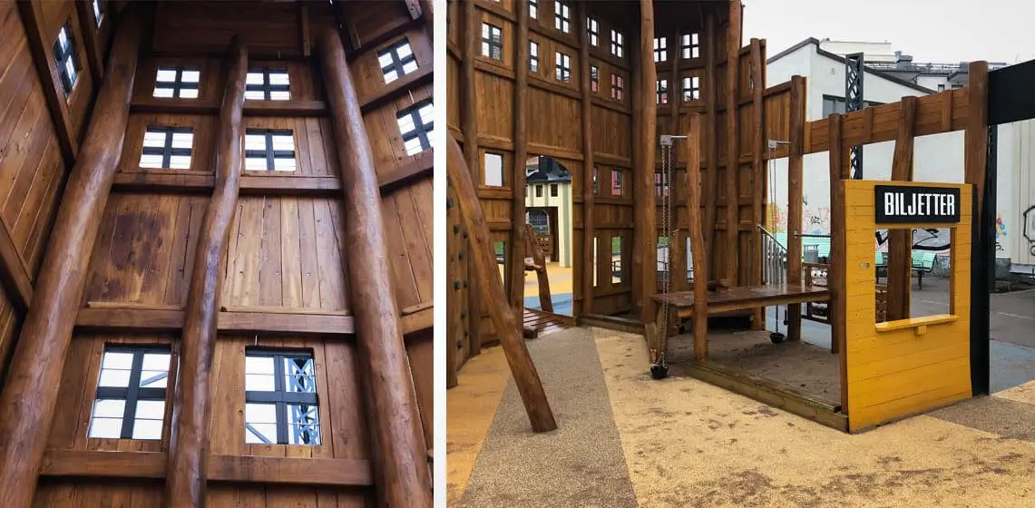 Legepladsen i Norrköping skiller sig ud fra mængden. Her har vi genskabt tre kendte bygninger midt i et nybygget boligområde.