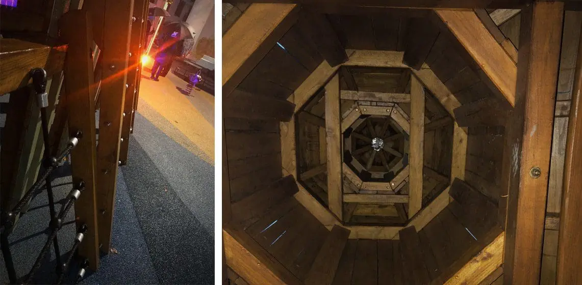 ”Värmekyrkan” fungerer som et gigantisk legehus, hvor man via platforme kan klatre helt op til toppen af den lange tunnelrutschebane.