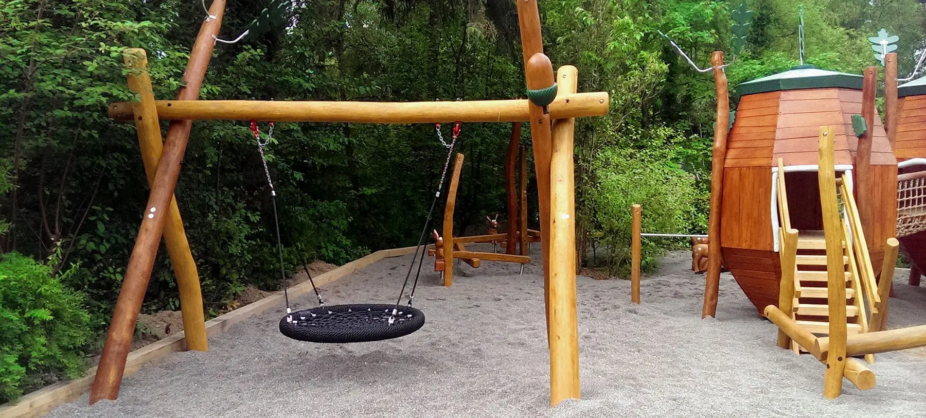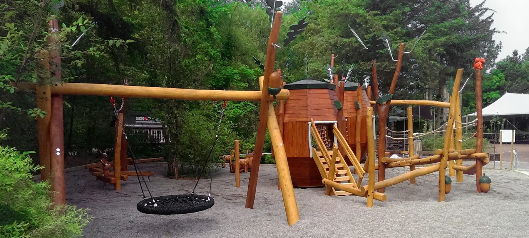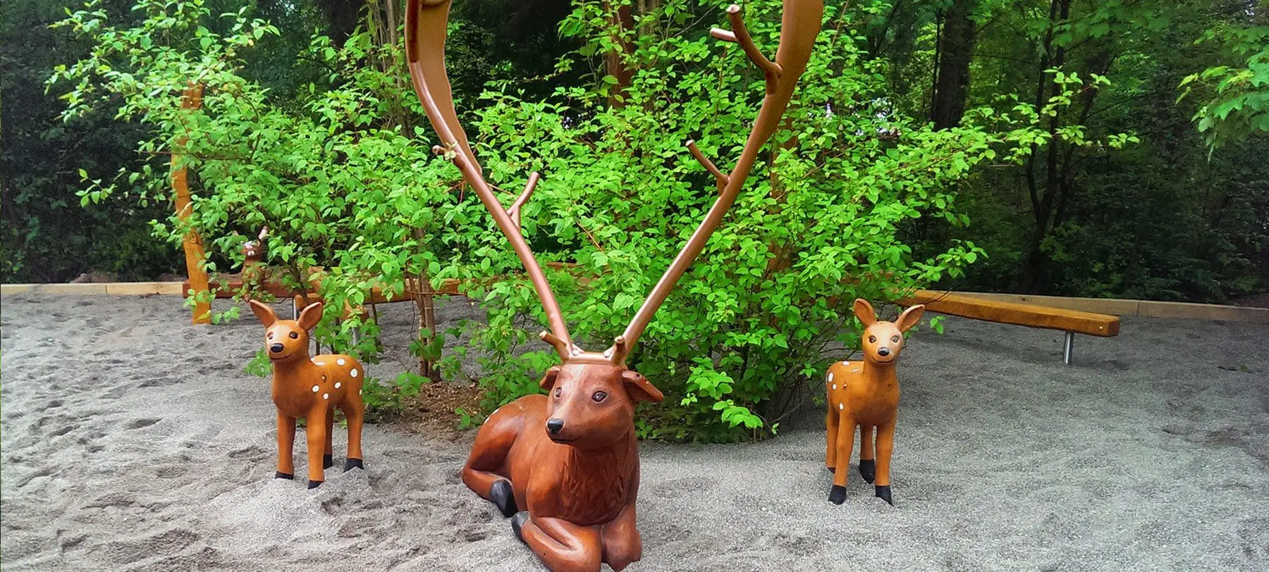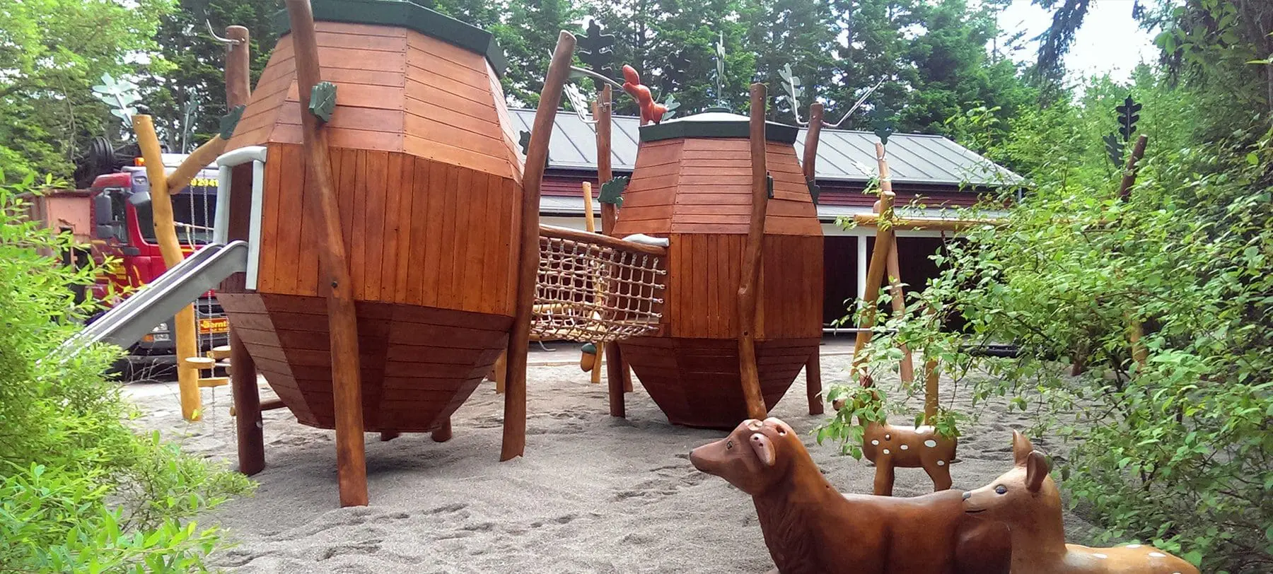Rundt omkring på legepladsen gemmer der sig egern, kaniner, pindsvin og hjorte, smukt håndskårne af Spielarts trækunstnere. Her kan man slippe fantasien løs og følge skovens dyr ind og ud af træer og op i fugleredegyngen eller til harehop balancebanen.