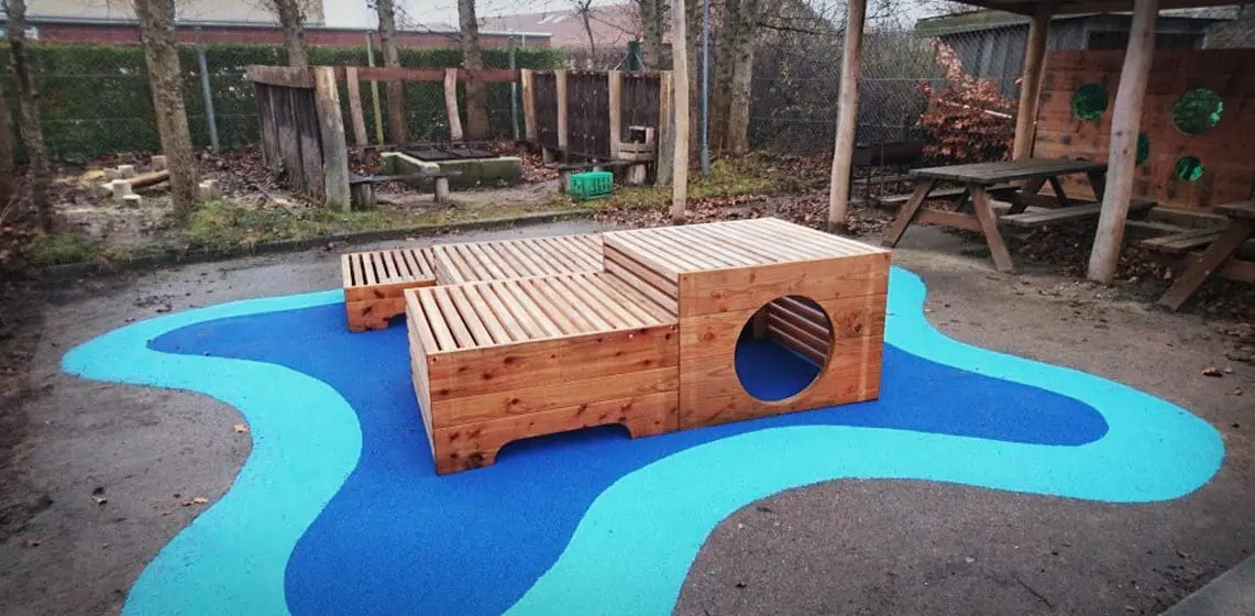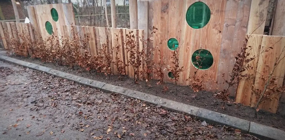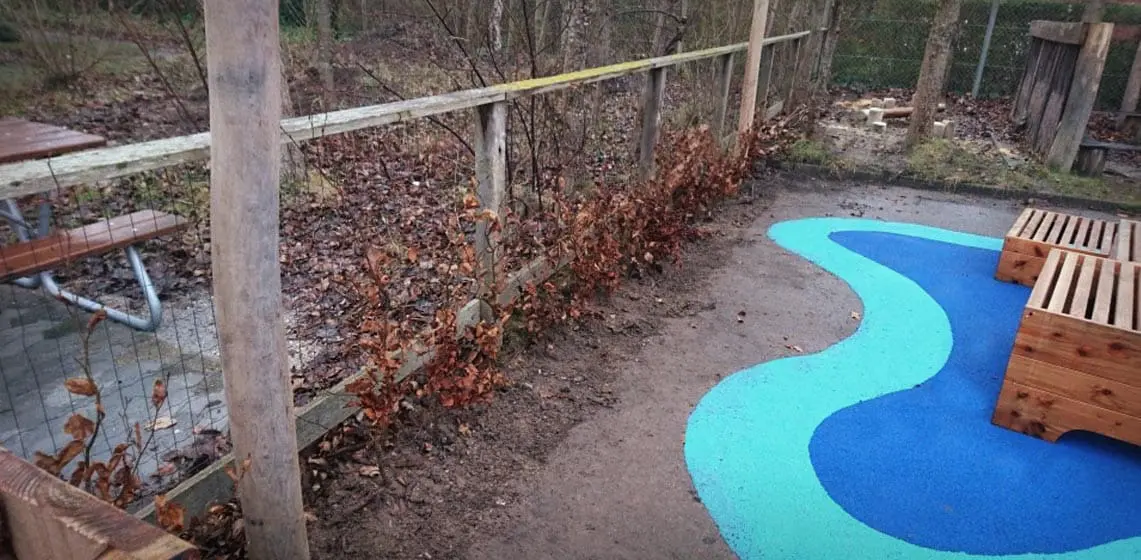 Det omsluttende hegn giver det afgrænsede rum og de farvede vinduer udkig til, at kunne vinke til forældre.