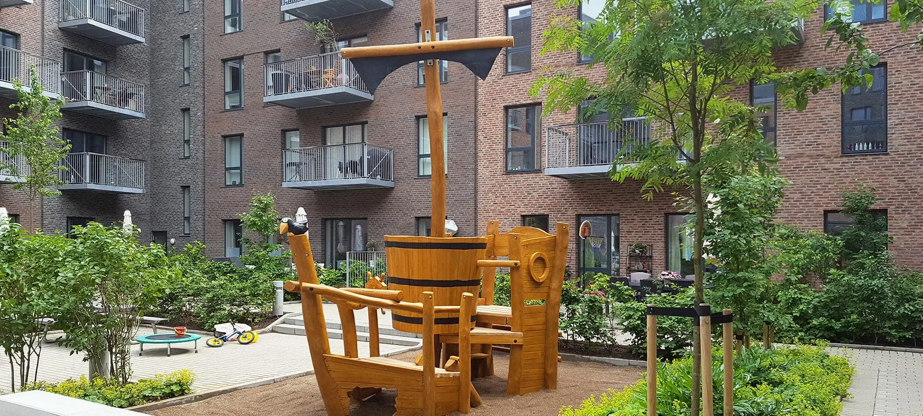 En baggård bliver hurtigt forvandlet til et brusende hav med det specialdesignede legeskib, man nu kan finde i Harbour Park ejerforening. Skibets skæve, næsten tegnefilmsagtige udseende er skabt i samarbejde med vores kreative leverandør Spielart.