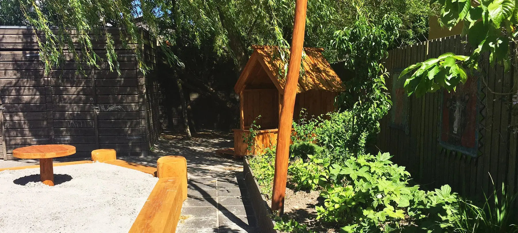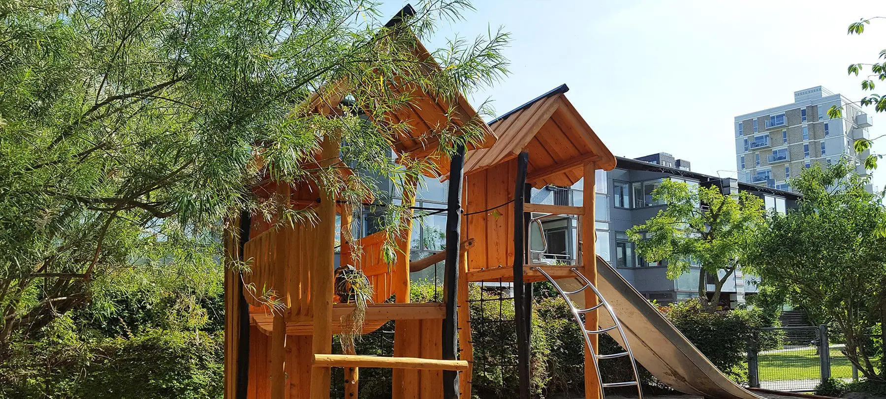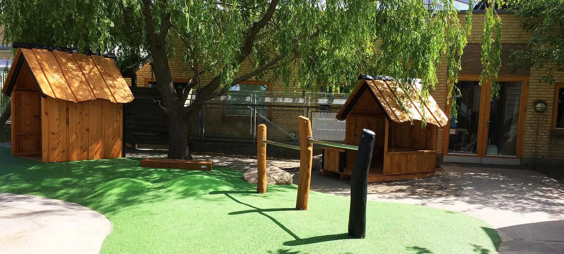 Den nye legeplads er stopfyldt med legeværdi. Her finder man både legetårn med klatrebaner og rutsjebaner, samt et boldbur til de mere vilde lege, og sandkasser, legehuse og små pausekroge i skyggen fra trækronerne til den mere rolige leg.