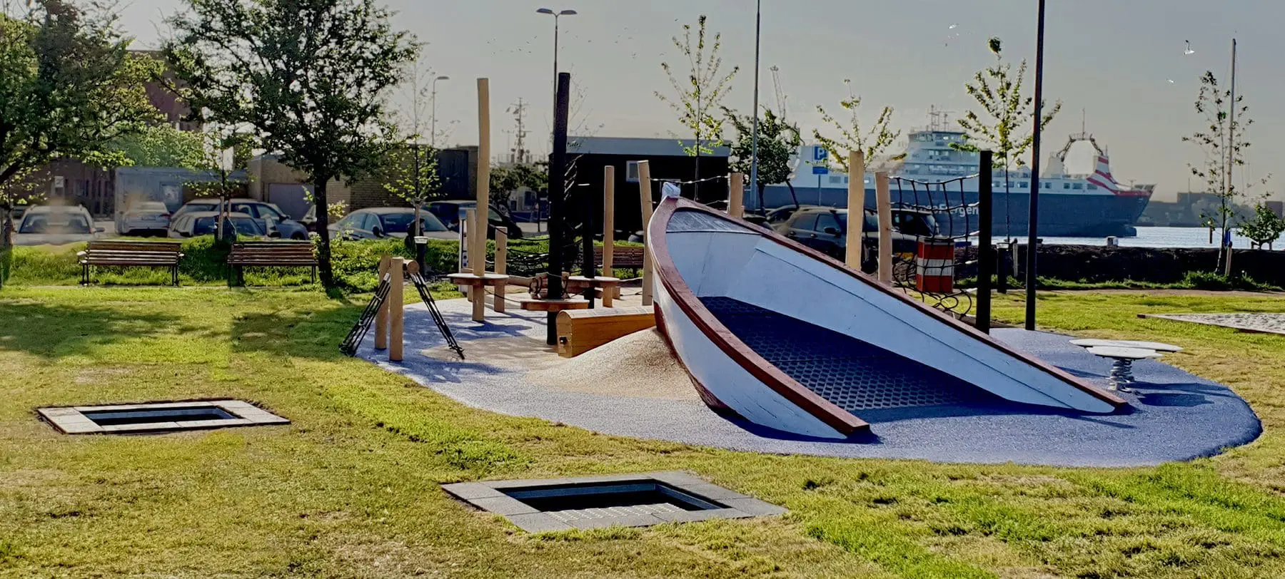 I Kalundborg Havnepark har vi trukket det bedste fra havnen med op på land til en smuk, åben og fantasifuld legeplads. En kutter er stødt på grund i sandet, en tovværksbane slanger sig som fiskenet rundt over åbne farvande og en skattekiste venter for enden af banen, men du må selv kravle ind i den for at finde ud af, hvad der gemmer sig.