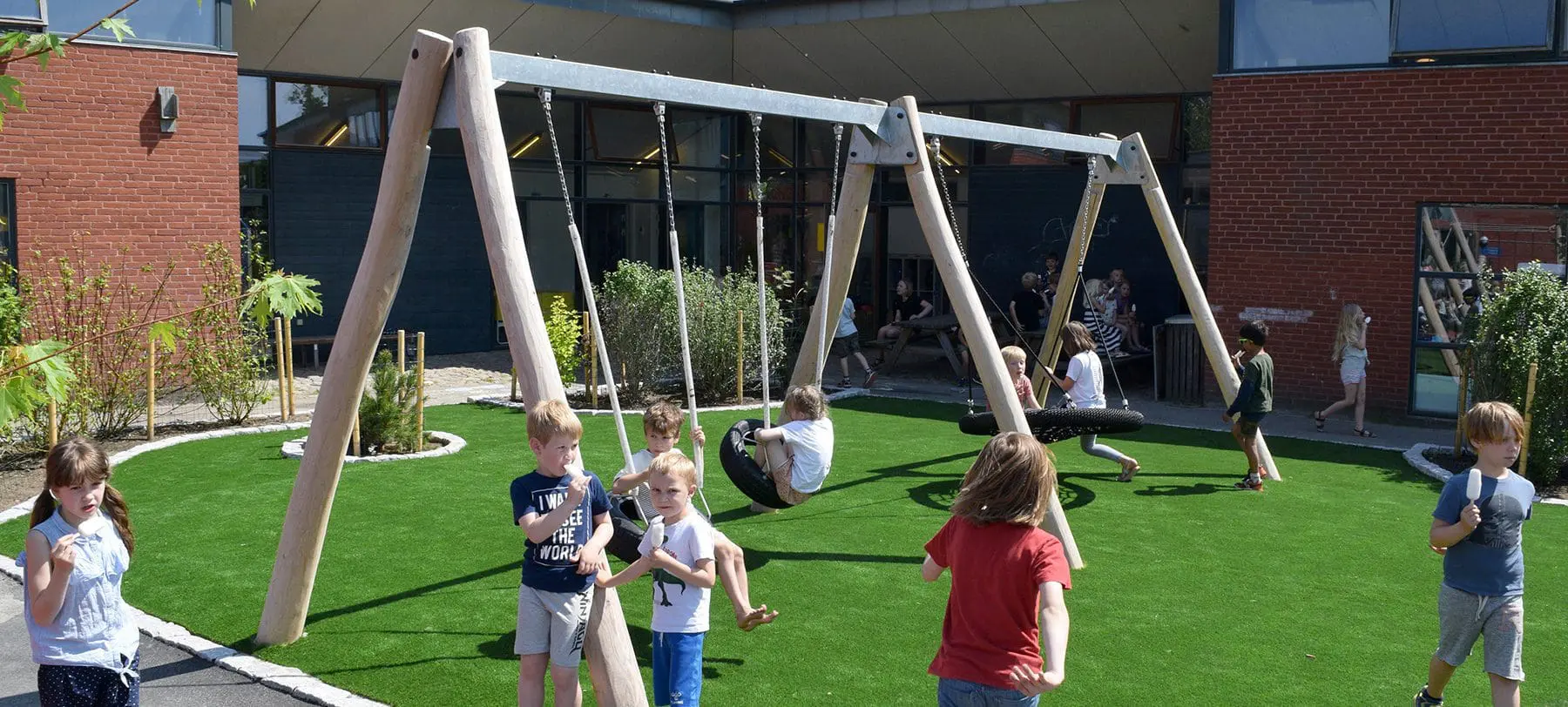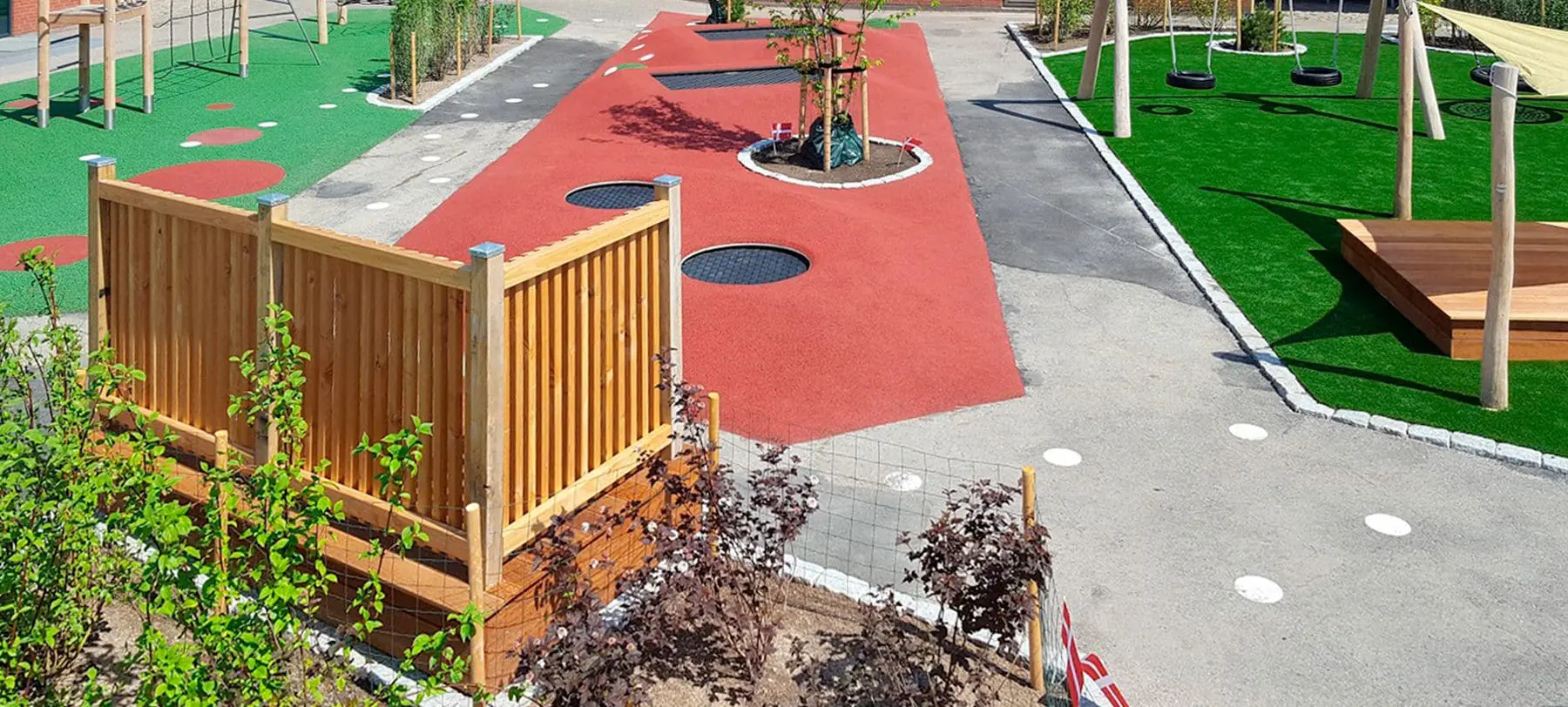 Når man bygger et legeområde til en skole, bygger man til et hav af forskellige aldre, temperamenter og behov. Derfor er det vigtigt med en alsidig løsning, der kan tilgodese de fleste. Løsning blev her at dele legepladsen på midten med én side rettet mod mere fysisk aktiv leg og én side rettet mod mere stille og rolig leg.