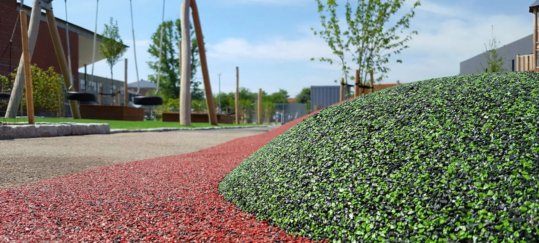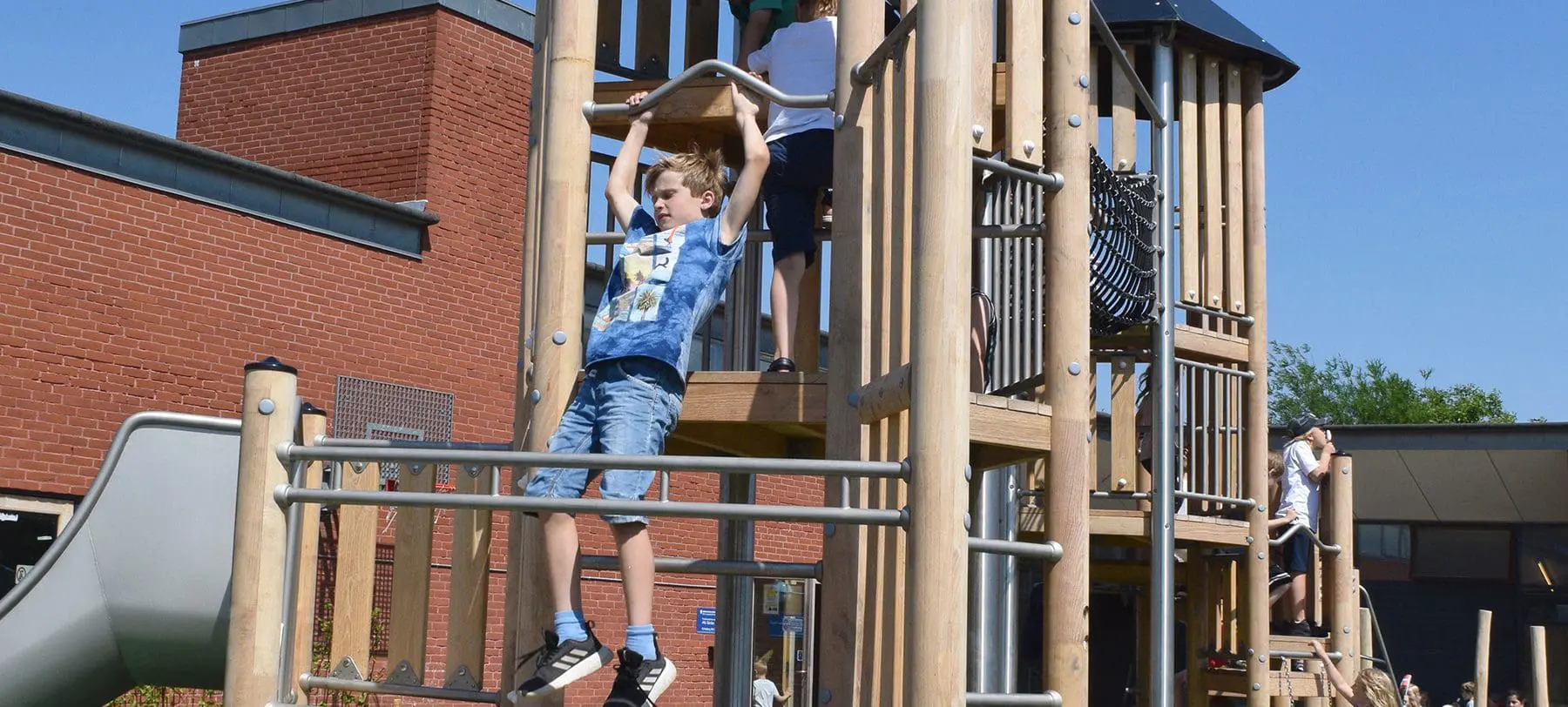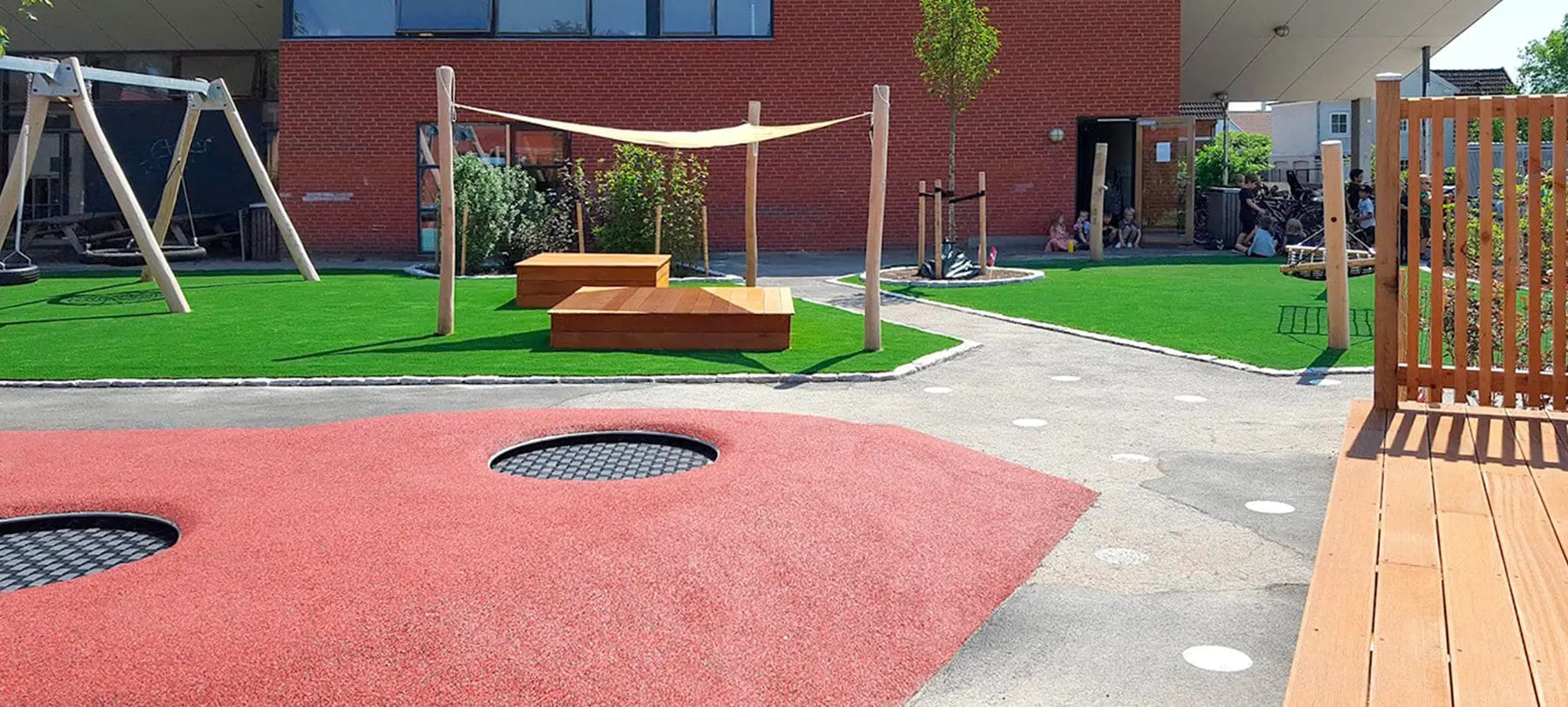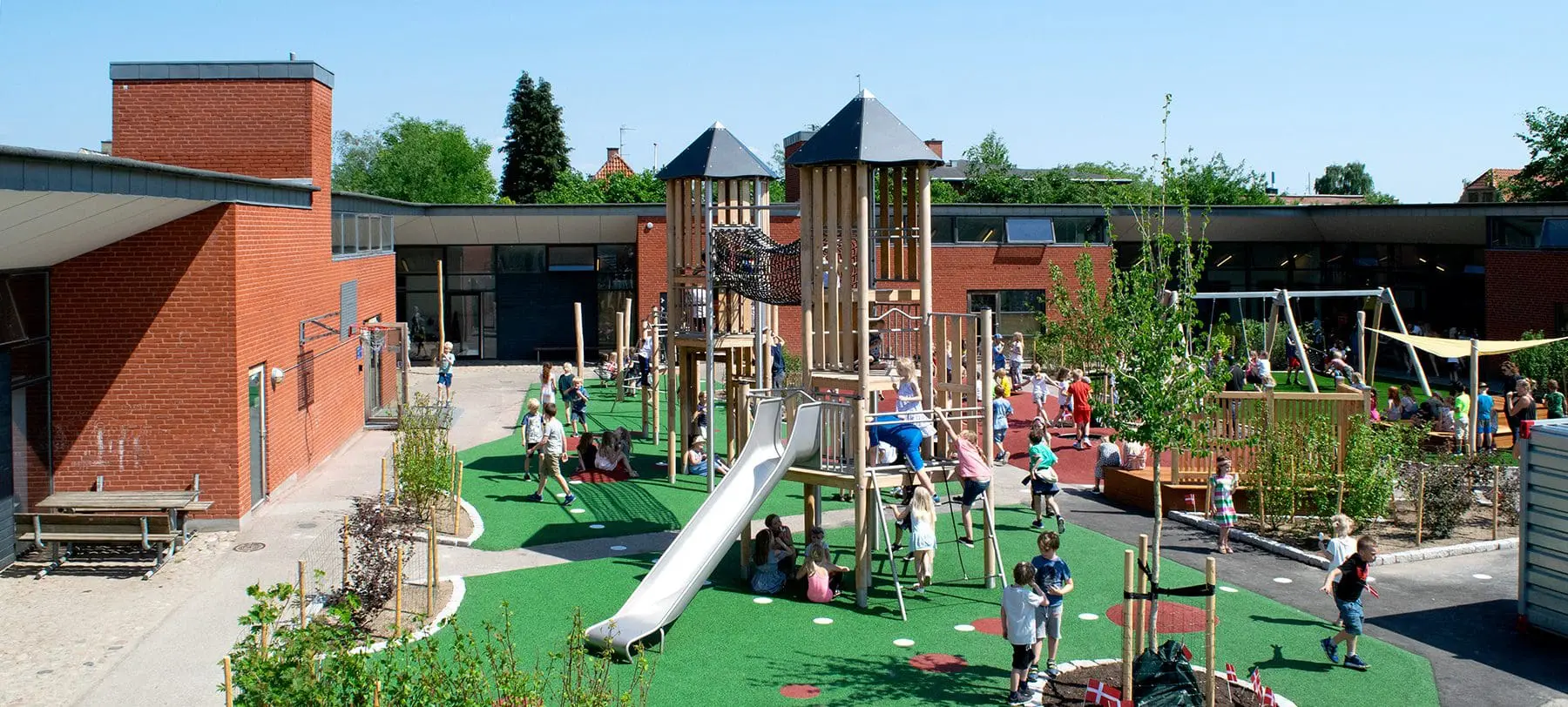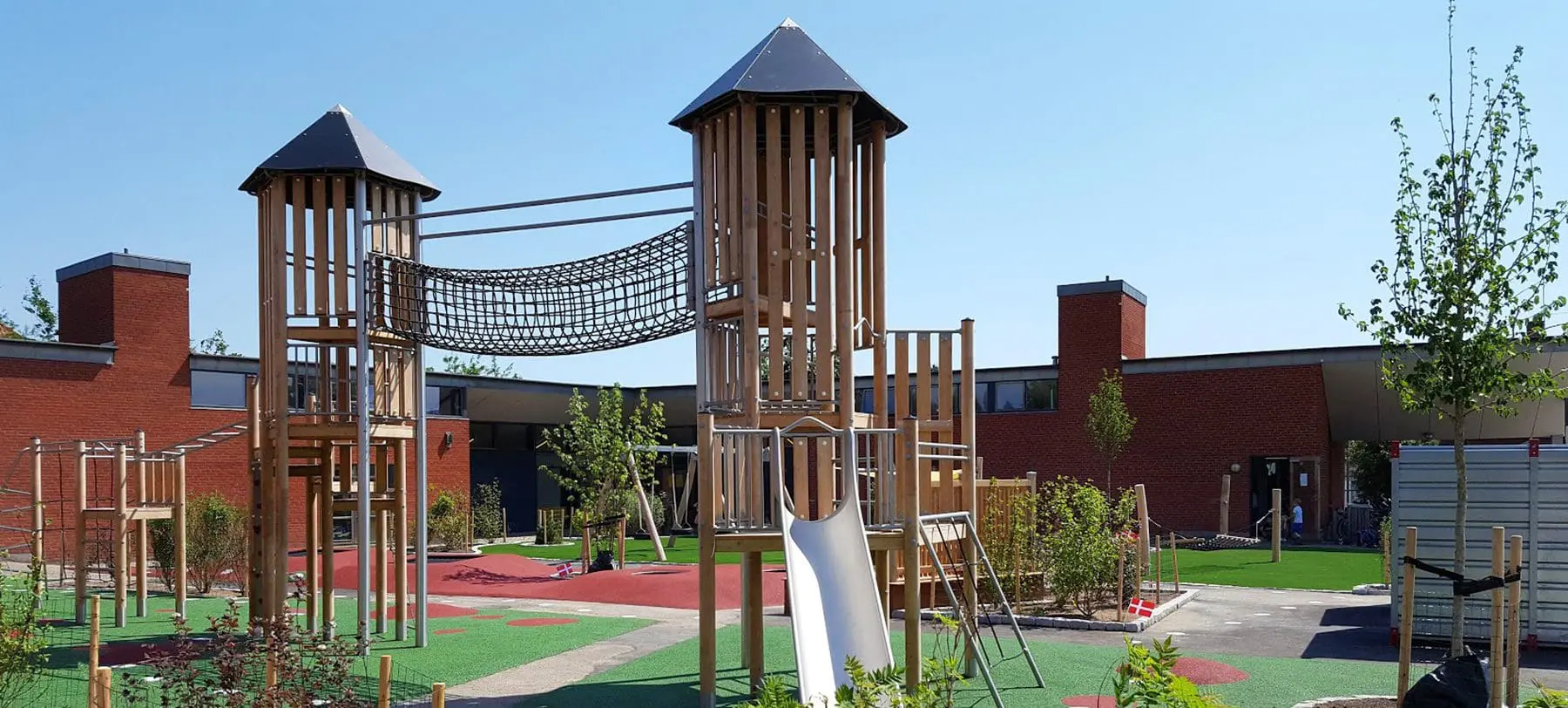 På den ene side står skolens nye, flotte legetårn, der giver børnene en masse udfordrende klatremuligheder med et blødt, farverigt gummiunderlag til beskyttelse. På den anden side finder vi trædæk og hængekøjer, hvor man kan lege mere stille eller simpelthen bare slappe af. Mellem de to sider er der både masser af luft, der giver plads til mange forskellige lege, uden de kommer i konflikt med hinanden, og en serie af trampoliner, hvor man kan sætte kroppen i bevægelse.