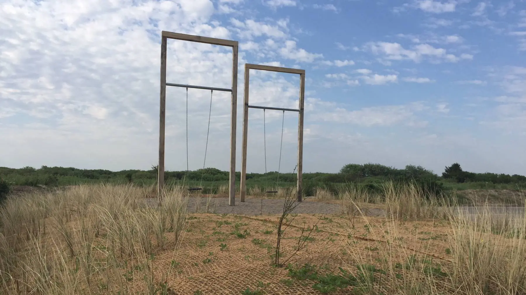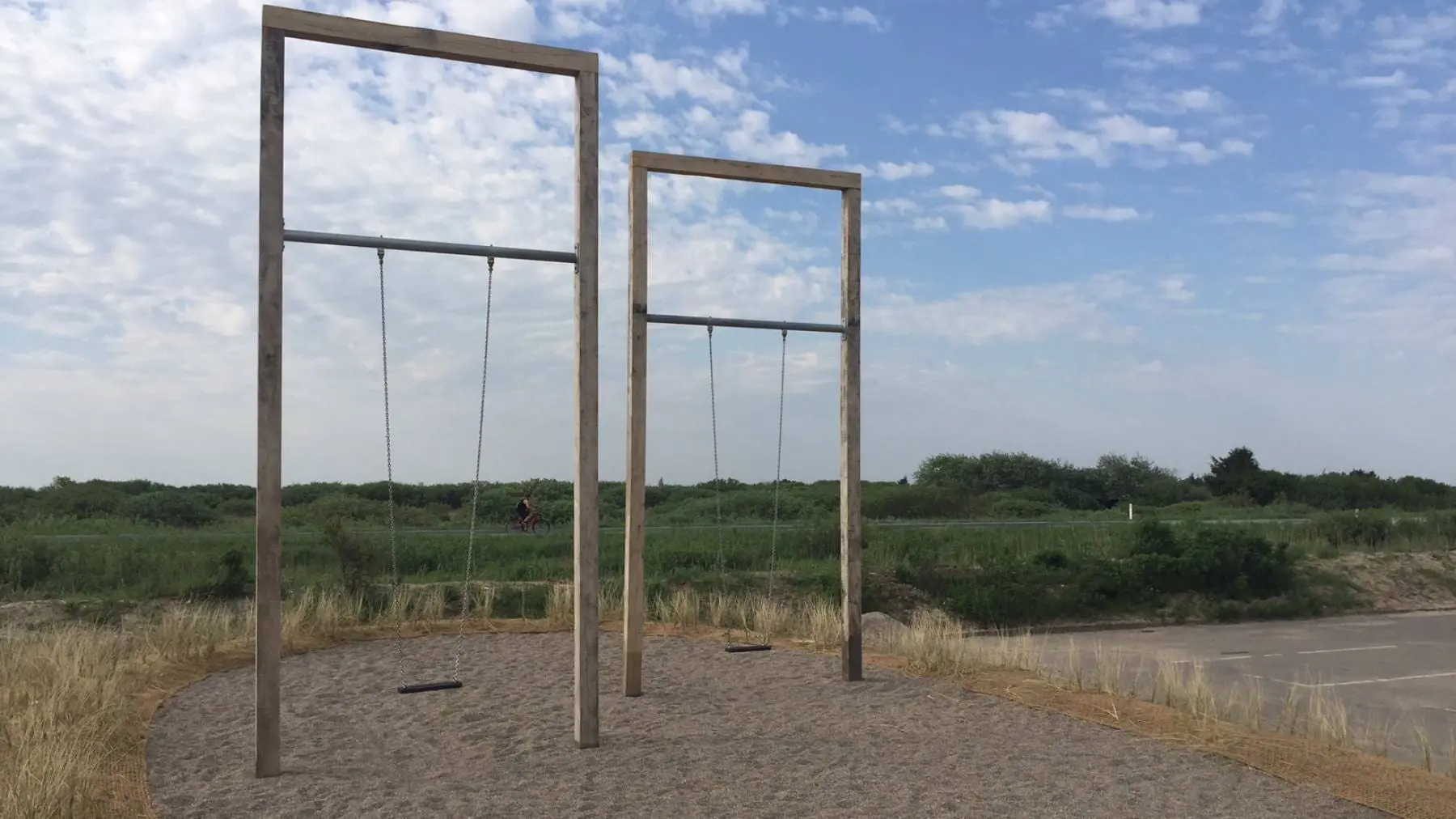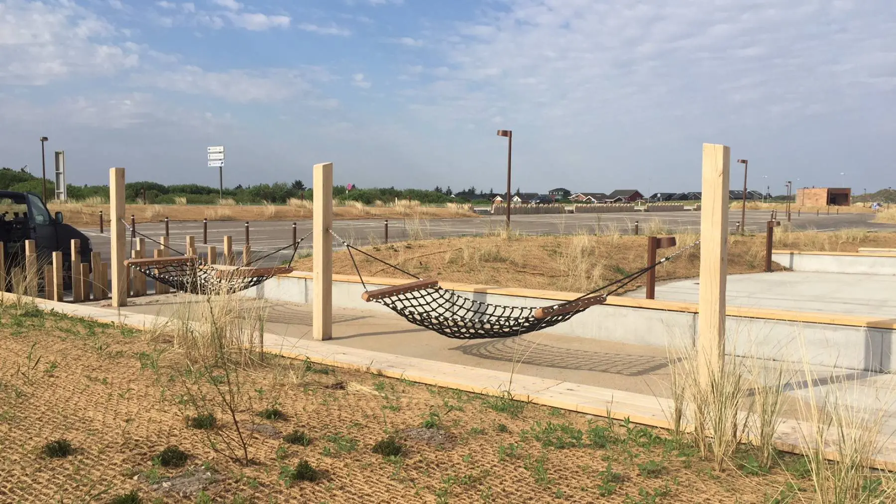 Omkranset af marehalm i klitter er der spændende legemuligheder for børnene, der her kan rutche, balancere, hygge sig i hængekøjerne eller få sig en gyngetur på det 5 m høje gyngestativ.