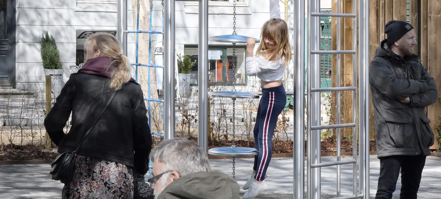 Med det nye lege- og uderum på Langeplads Plads på Frederiksberg er der lagt stor vægt på at skabe en plads til både fysisk aktivitet og rolige gøremål. Pladsen er delt op i et træningsområde, et legeområde og mange små pausesteder, så der både er plads til bevægelse og stille samtale.