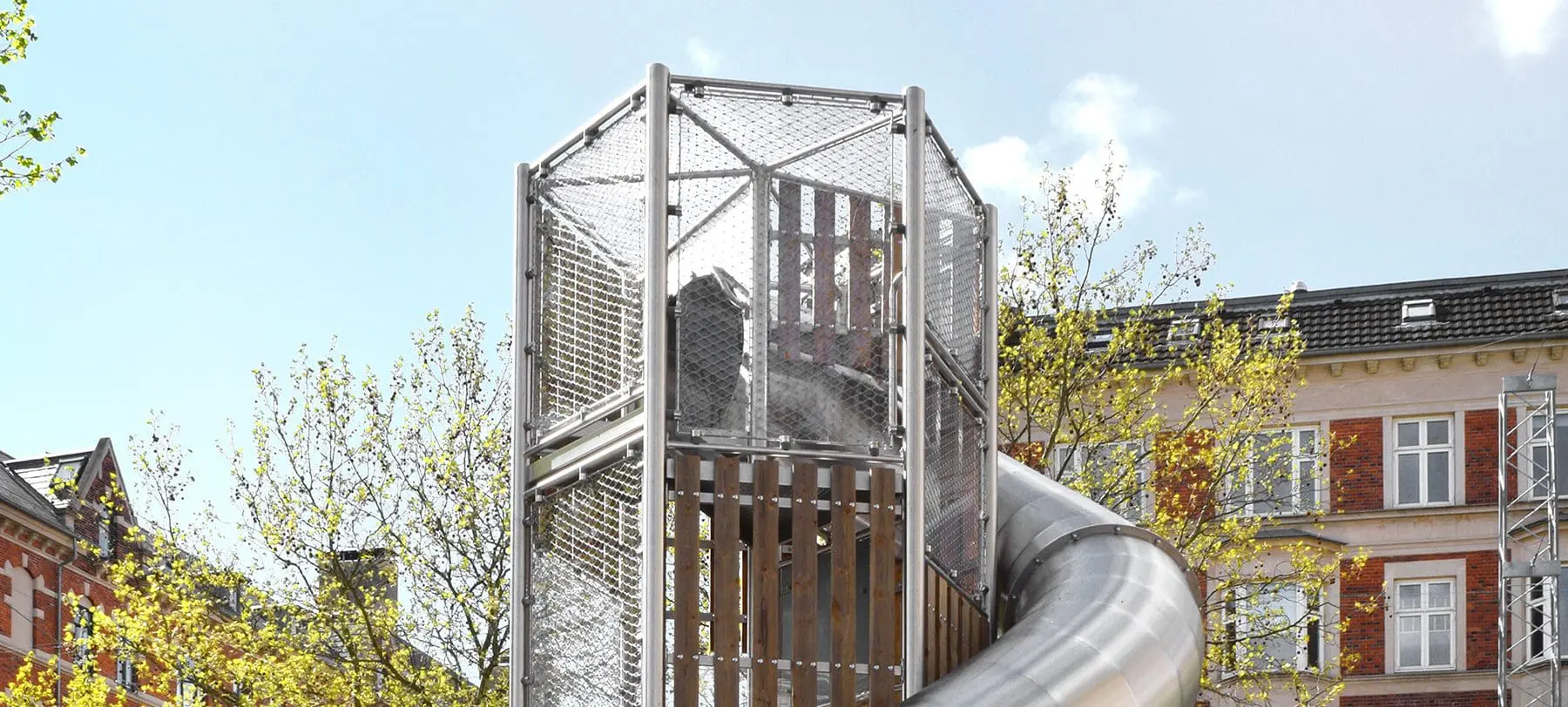 Legeområdet er ligesom træningsområdet skabt med et design, der med både farver og materialer passer lige ind i bybilledet. Legepladsen består af et 6 meter højt, moderne klatretårn med rutsjebane, en klatreklode og en klatreramme, hvor børnene kan få kroppen i bevægelse, samt en gynge og en sandkasse til mere rolig leg.