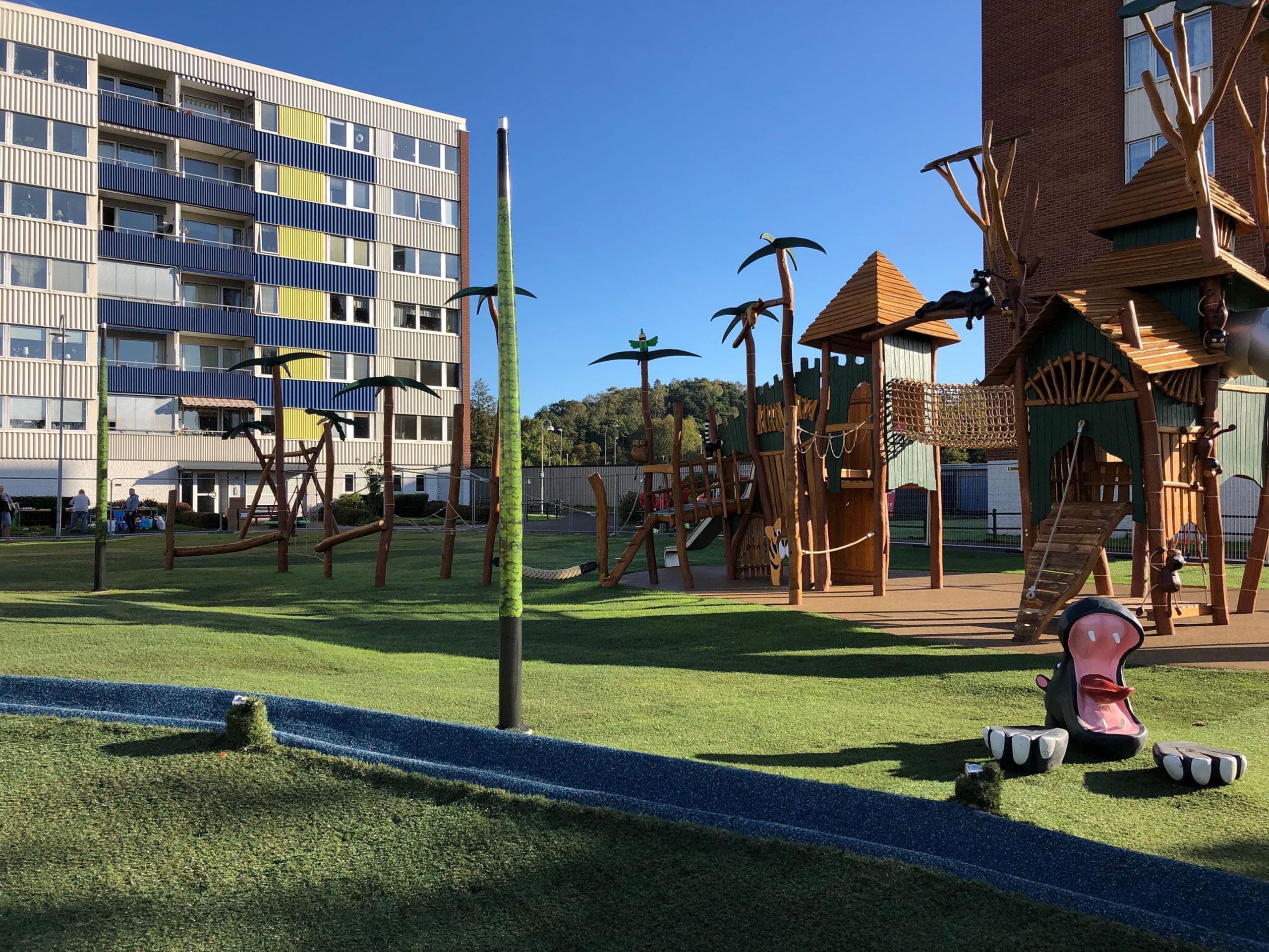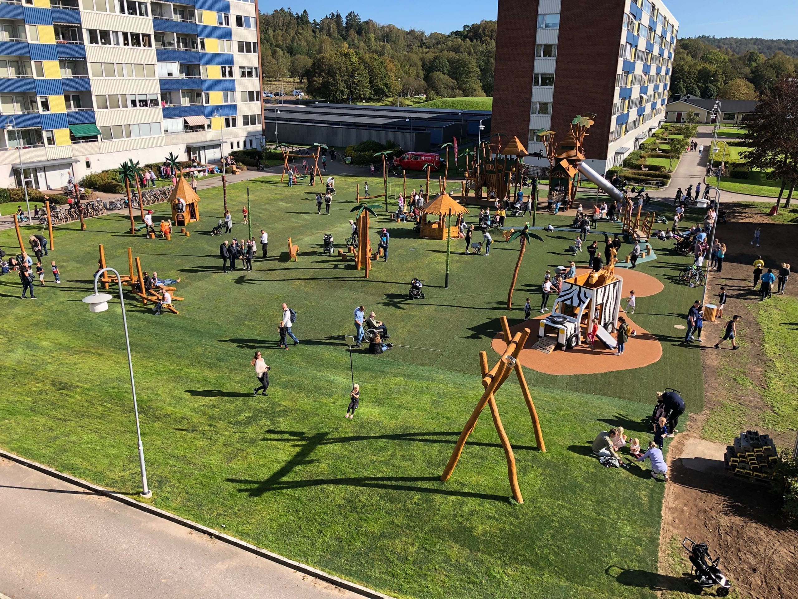 En oas mellan höghusen. BRF Lillekärr Norra ville göra något utöver det vanliga så vi gjorde tillsammans en Djungellekplats som gör rätt för namnet. Med mer yta mellan redskapen bli det spring i benen för de minsta och plats för alla att slå sig ner och njuta och umgås.