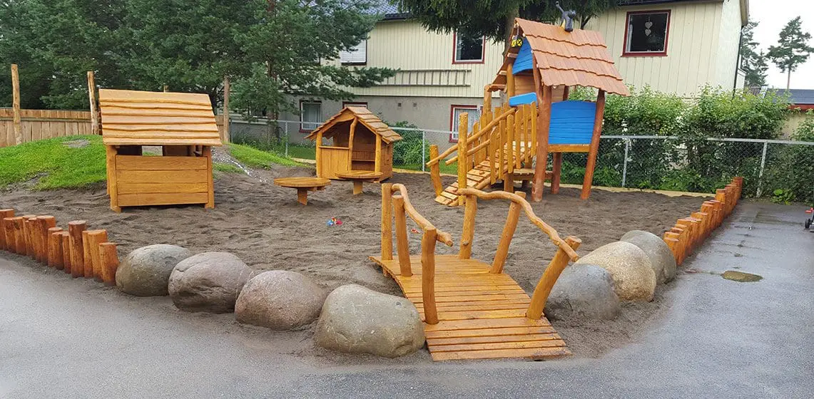 Sandlandet består af en buet bro, balance sten, stående robiniepalisade, et hegn for indramning, sand bord og et hemmeligt område med en “begravet skat”, play hytter og Lite Troll Workshop her.