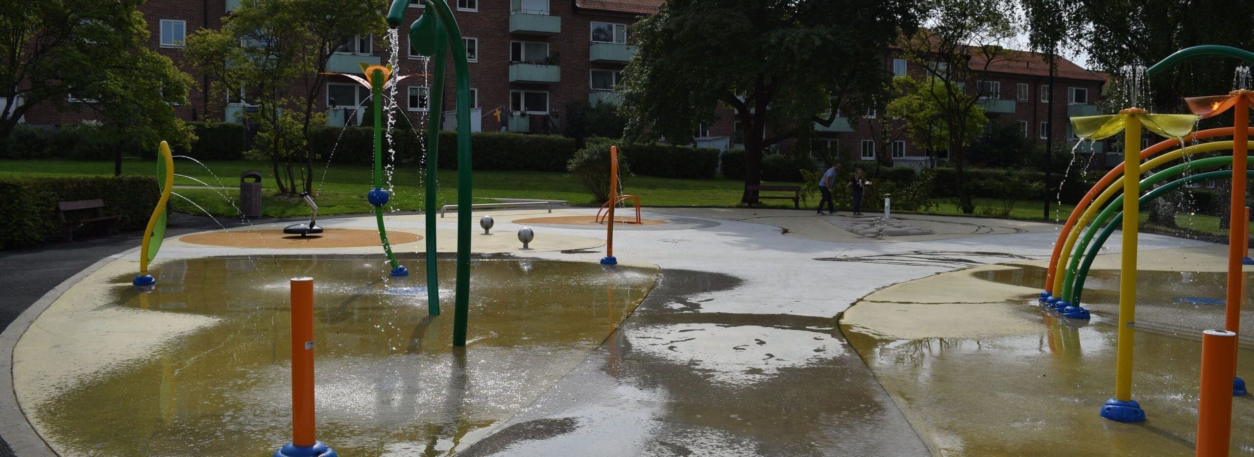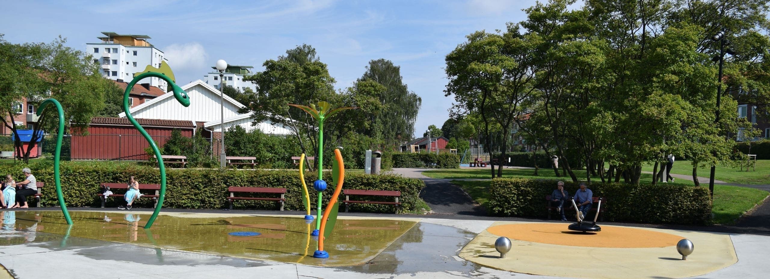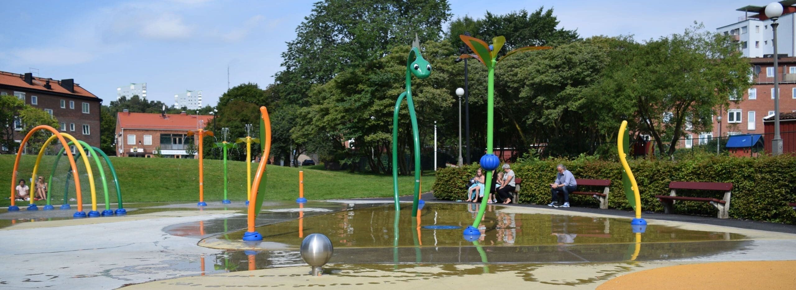 I detta projekt fick vi till uppgift att göra om den gamla plaskdammen i parken till en mer attraktiv plats för barnfamiljerna i området. Idag är detta en plats dit både barn och vuxna kommer för att umgås, leka och svalka av sig på. Här kan man leka med vattenslussarna i Water Journey, vattensprutande drake och mycket annat. Om man inte vill blöta ner sig så finns här även en tillgänglighetsanpassad karusell, balansbom och en snurrande myra att leka på. Vattenparkens redskap kommer från leverantör Vortex i Kanada.